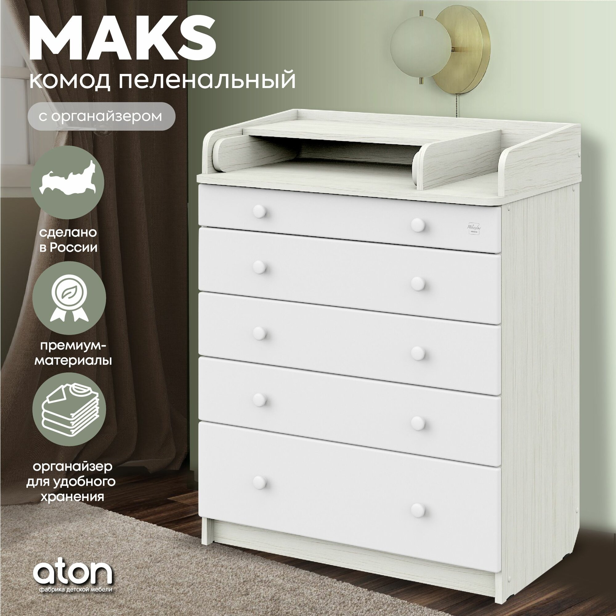 Комод пеленальный Атон MAKS ЛДСП 800/5 с органайзером, древесина белая-белый
