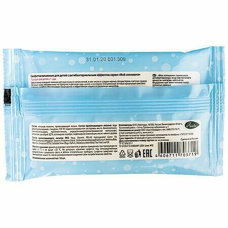 Салфетки влажные для детей Моё Солнышко с антибактериальным эффектом 10 шт.