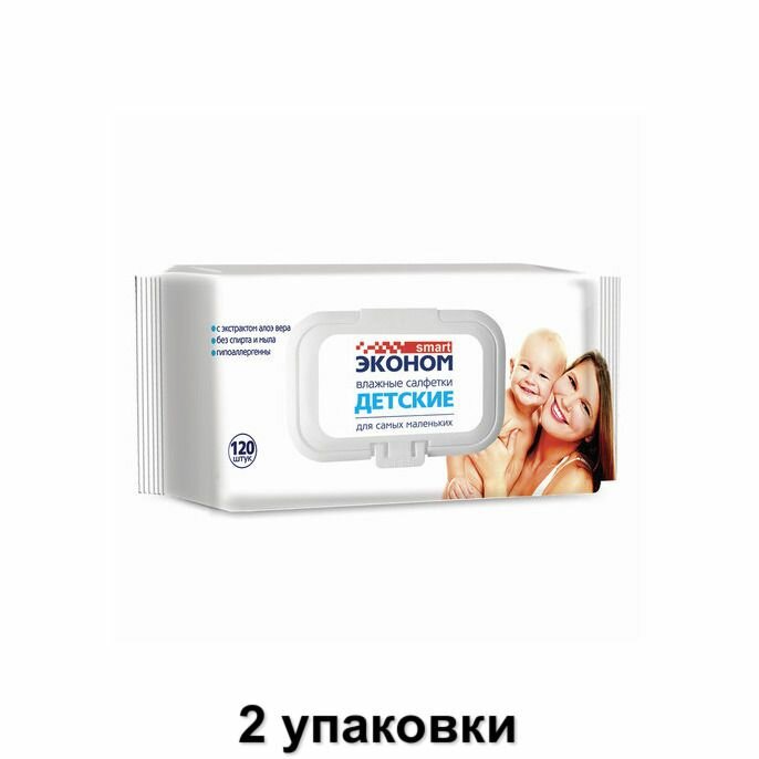 Влажные салфетки Эконом smart Детские с экстрактом алоэ вера, пластиковая крышка, 120 шт., 1 уп.