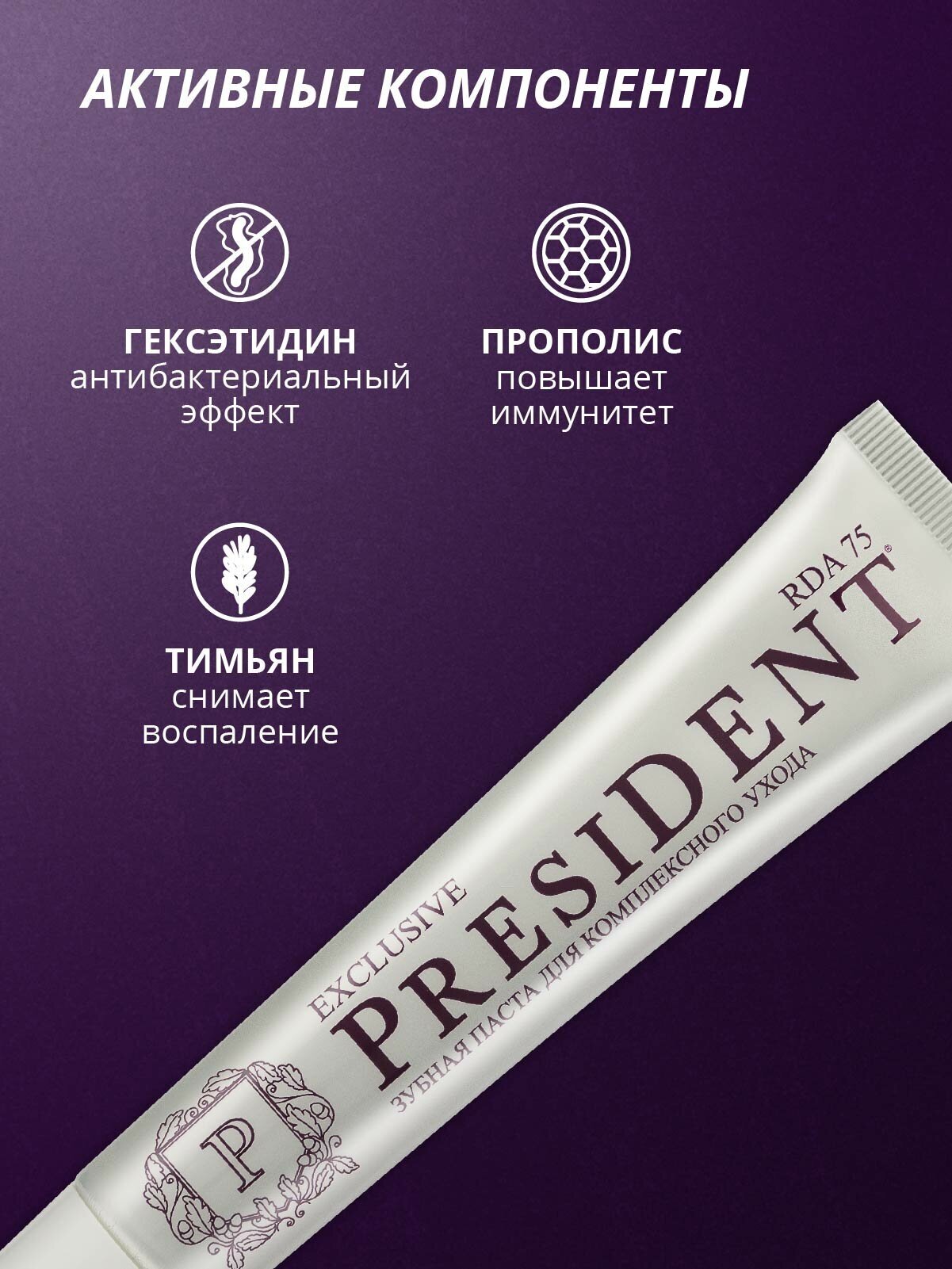 | Плюсы: | Зубная паста presiDENT® exclusive. Тимьян, прополис, гексетидин ??? |