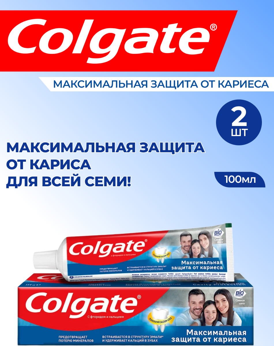 Colgate Зубная паста Максимальная защита от кариеса Свежая мята с комплексом кальция и фторида 100 мл - 2 шт
