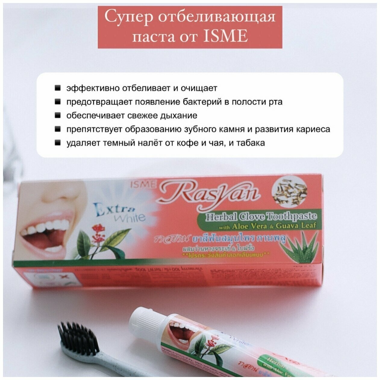 Отбеливающая Тайская зубная паста ISME Rasyan травяная гвоздичная с алоэ вера и листьями гуавы, 30 мл, 30 г