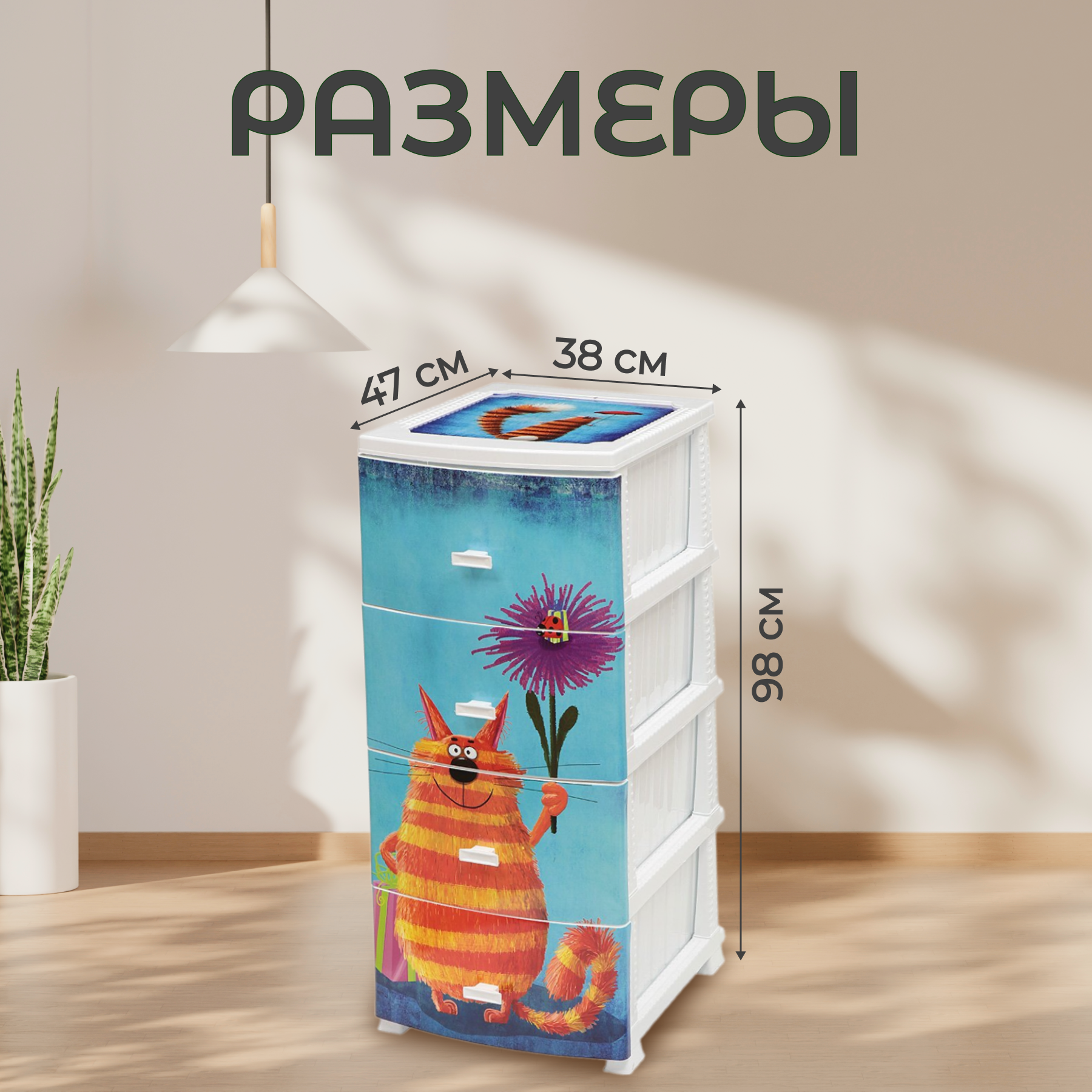 Комод детский 4 ящика, Кот, 38х47х98 см, белый, Росспласт, РП-451