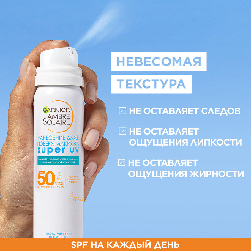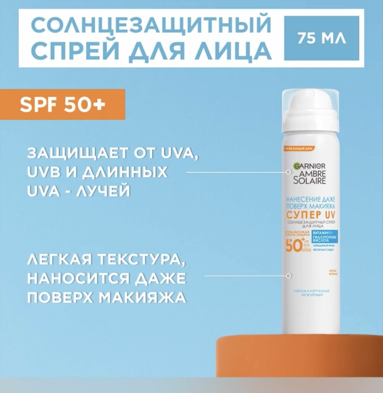 СохранитьСолнцезащитный спрей для лица Garnier Ambre Solaire SPF 50+, гипоаллергенный, подходит для нанесения поверх макияжа, 75 мл интересное: