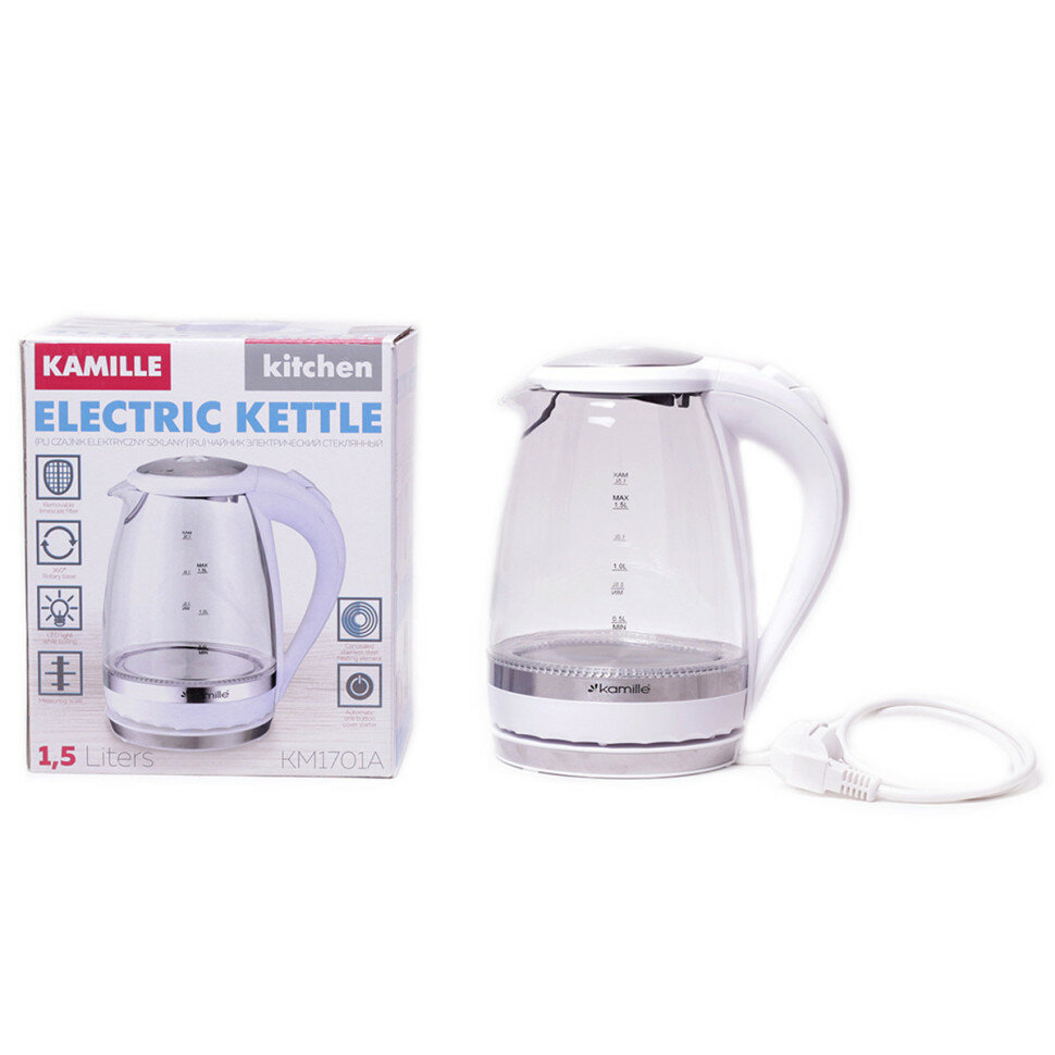 Чайник электрический 1,5 л. стеклянный Kamille KM-1701A (белый) с синей LED подсветкой