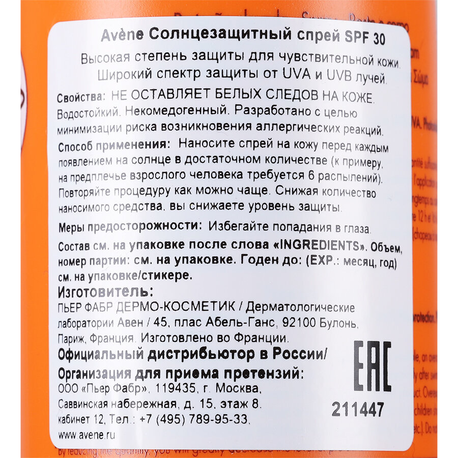 Авен солнцезащитный спрей SPF30 ФЛ.200МЛ (C22992)