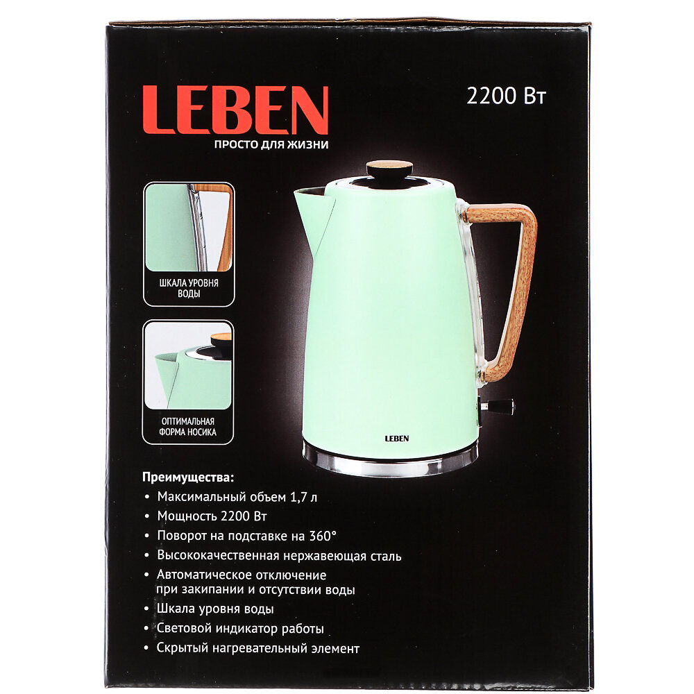LEBEN Чайник электрический 1,7л, 2200Вт, черный, 220-240В