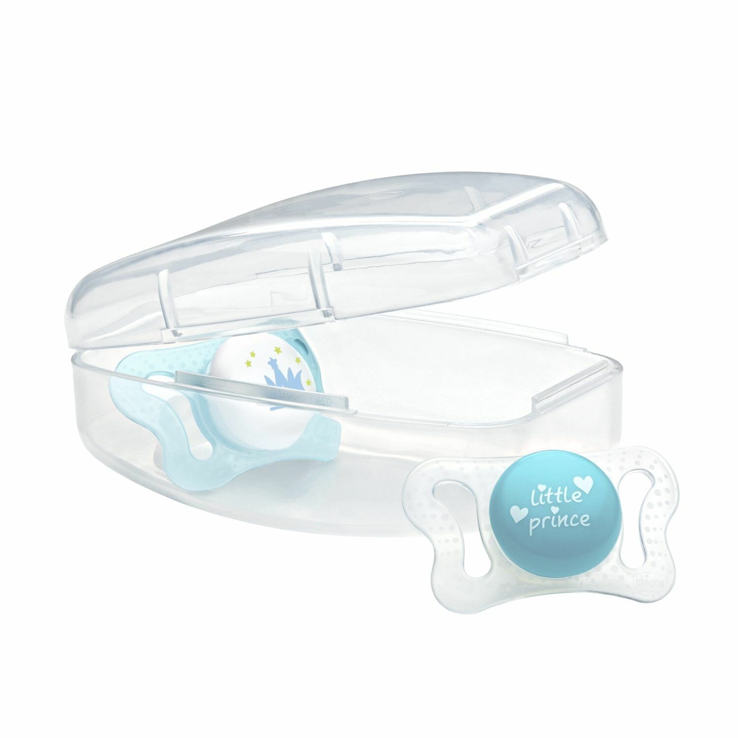 Пустышка силиконовая Chicco MICRO, 2шт., 0-2 мес., для принца, рисунок корона/соска пустышка 0/для новорожденных/держатель для соски/силиконовая соска для мальчика/2 штуки соски / футляр для сосок/чико
