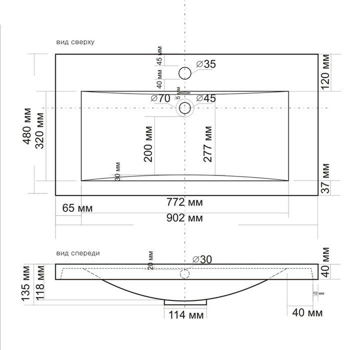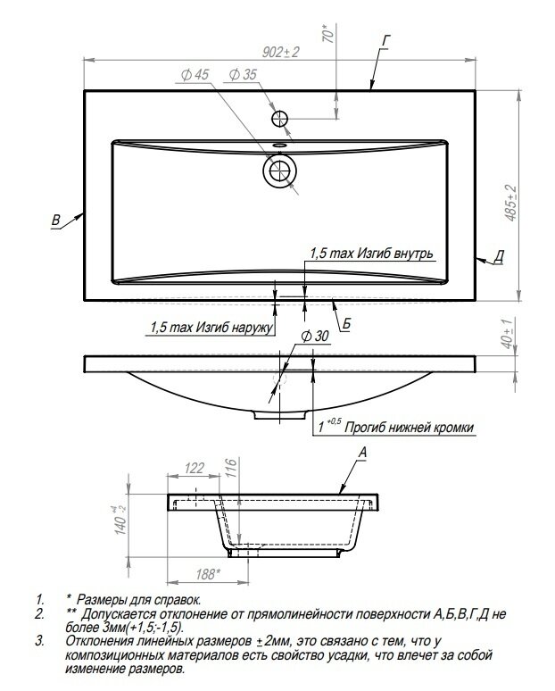Умывальник "Andrea 90" (литьевой мрамор, 900х480х140) встраиваемый