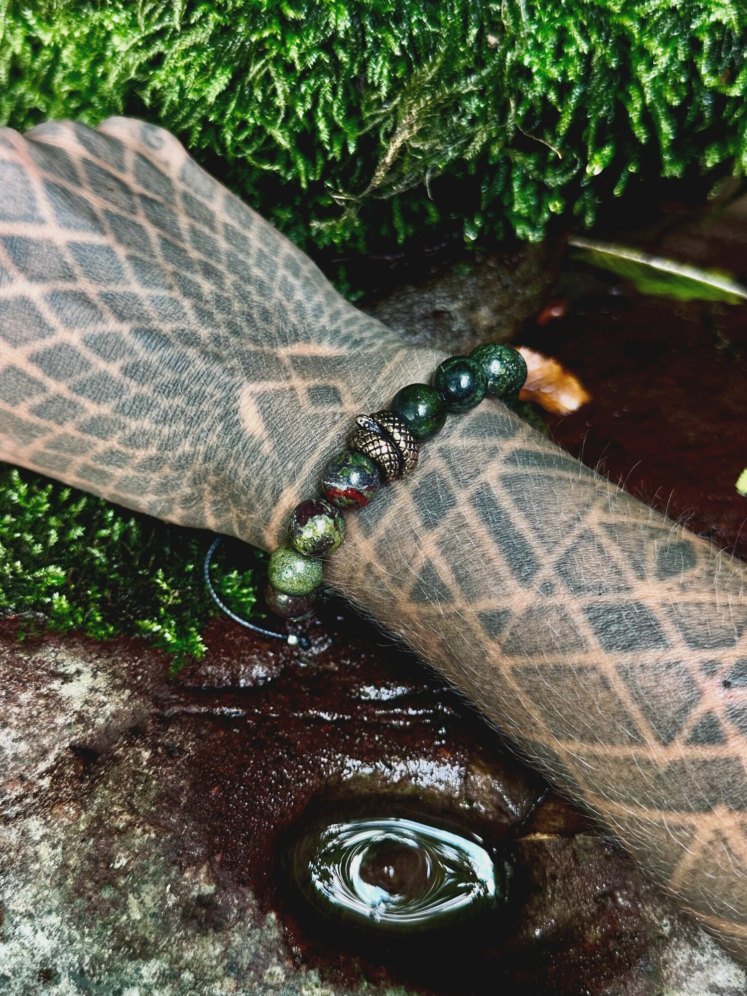 Браслет из натуральных камней яшма, змеевик, бронзовая бусина змея плетеный шамбала-18-22