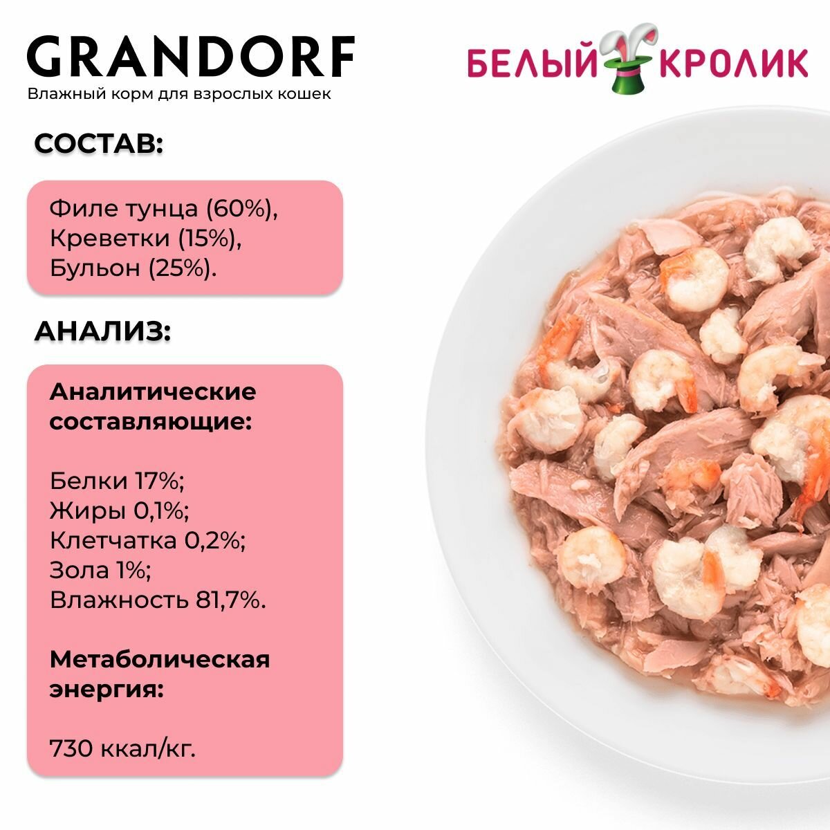 СохранитьВлажный корм для кошек Grandorf, Филе тунца с креветками в собственном соку, 70 гр. ( 6 штук) интересное: