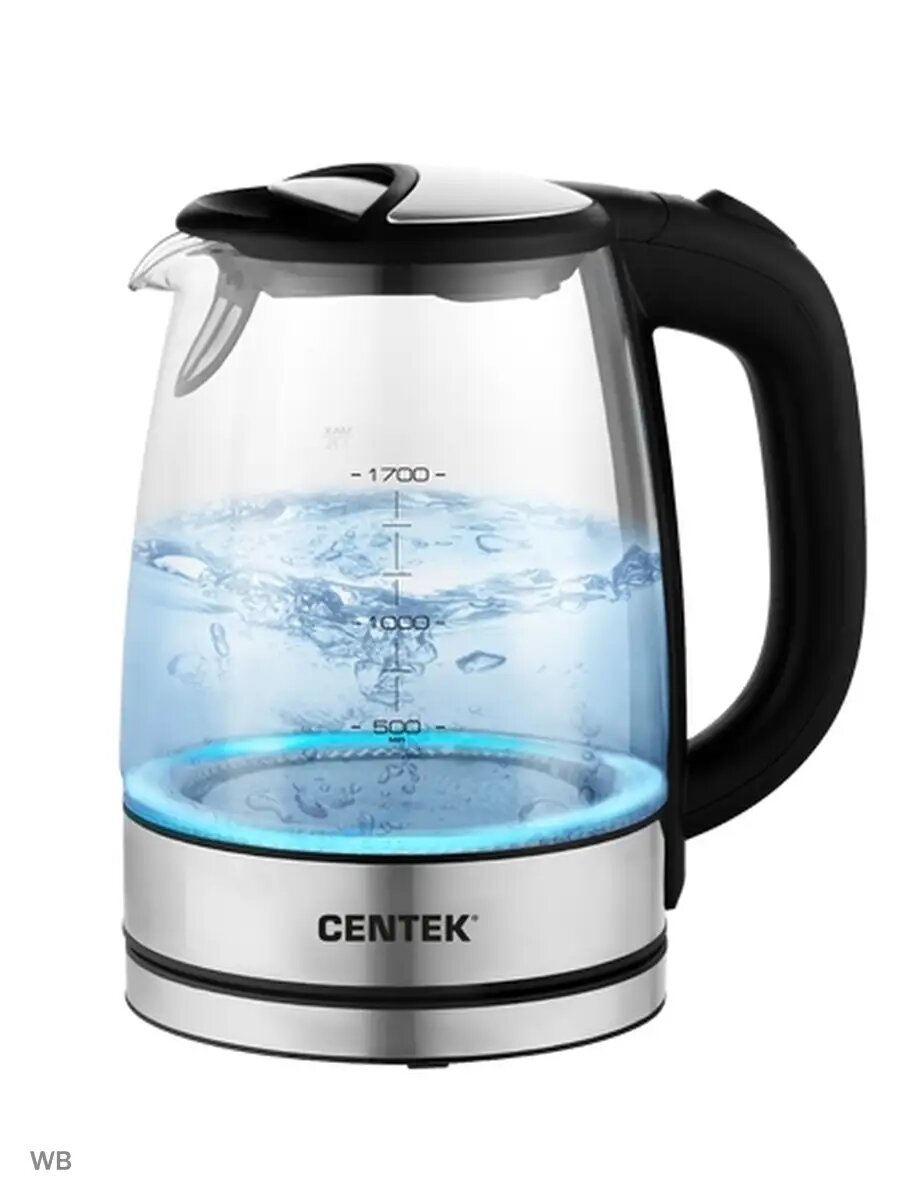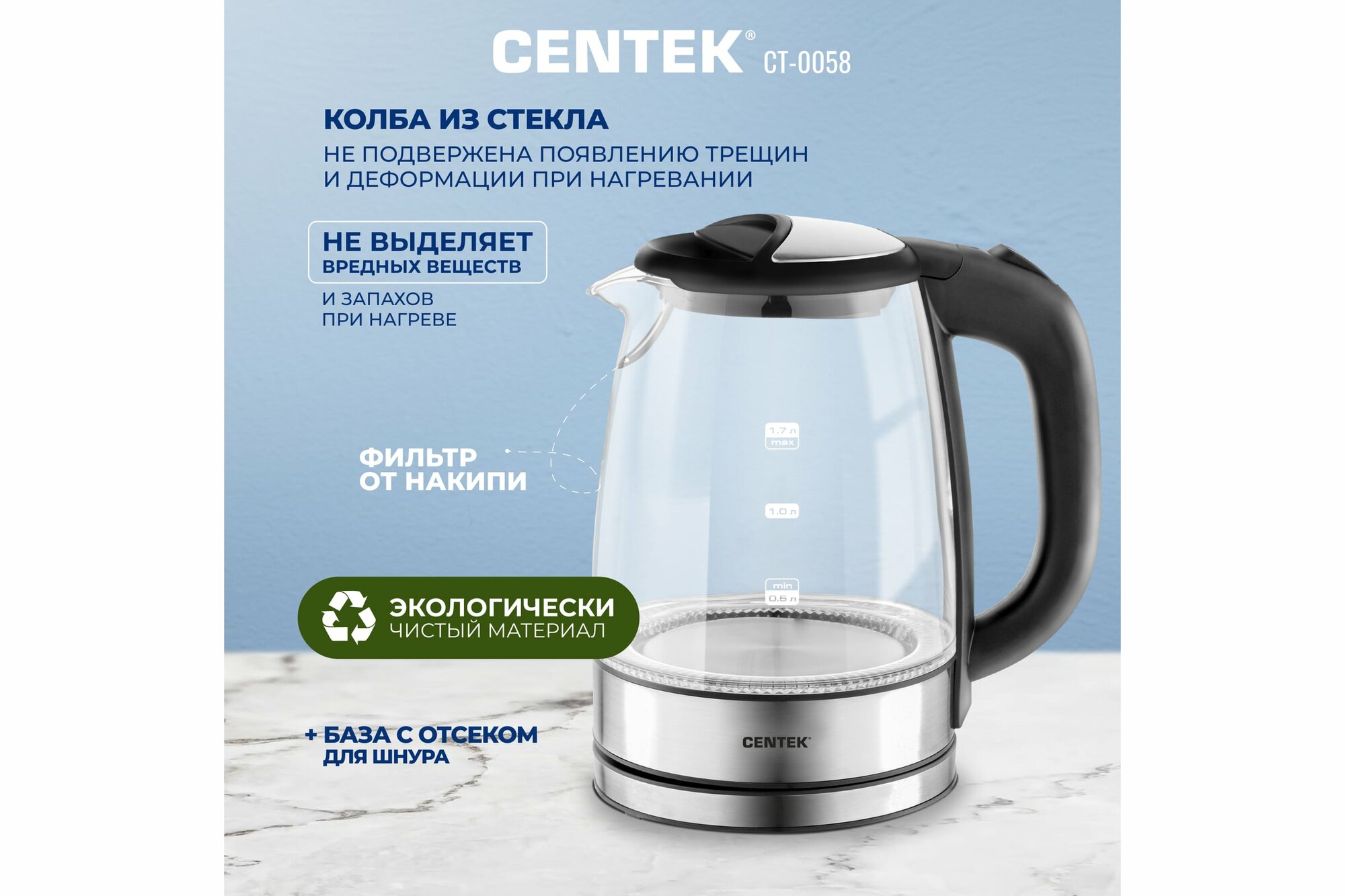 Электрический стеклянный чайник Centek CT-0058: 1.7л, LED-подсветка, вращение базы на 360гр, защита от перегрева