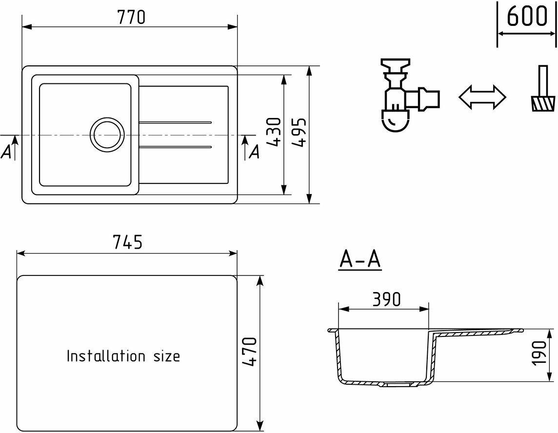 Мойка Ulgran, мрамор, U-507-308, (770*495*190 мм), черный, сифон и сливная арматура