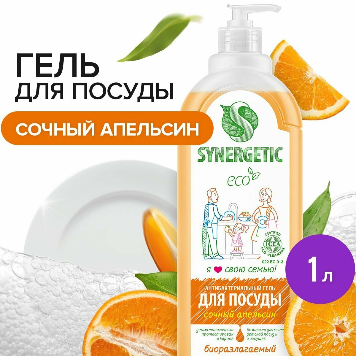 Гель для мытья посуды SYNERGETIC Сочный апельсин 1 л, антибактериальное, гипоаллергенное, биоразлагаемое, эко, моющее
