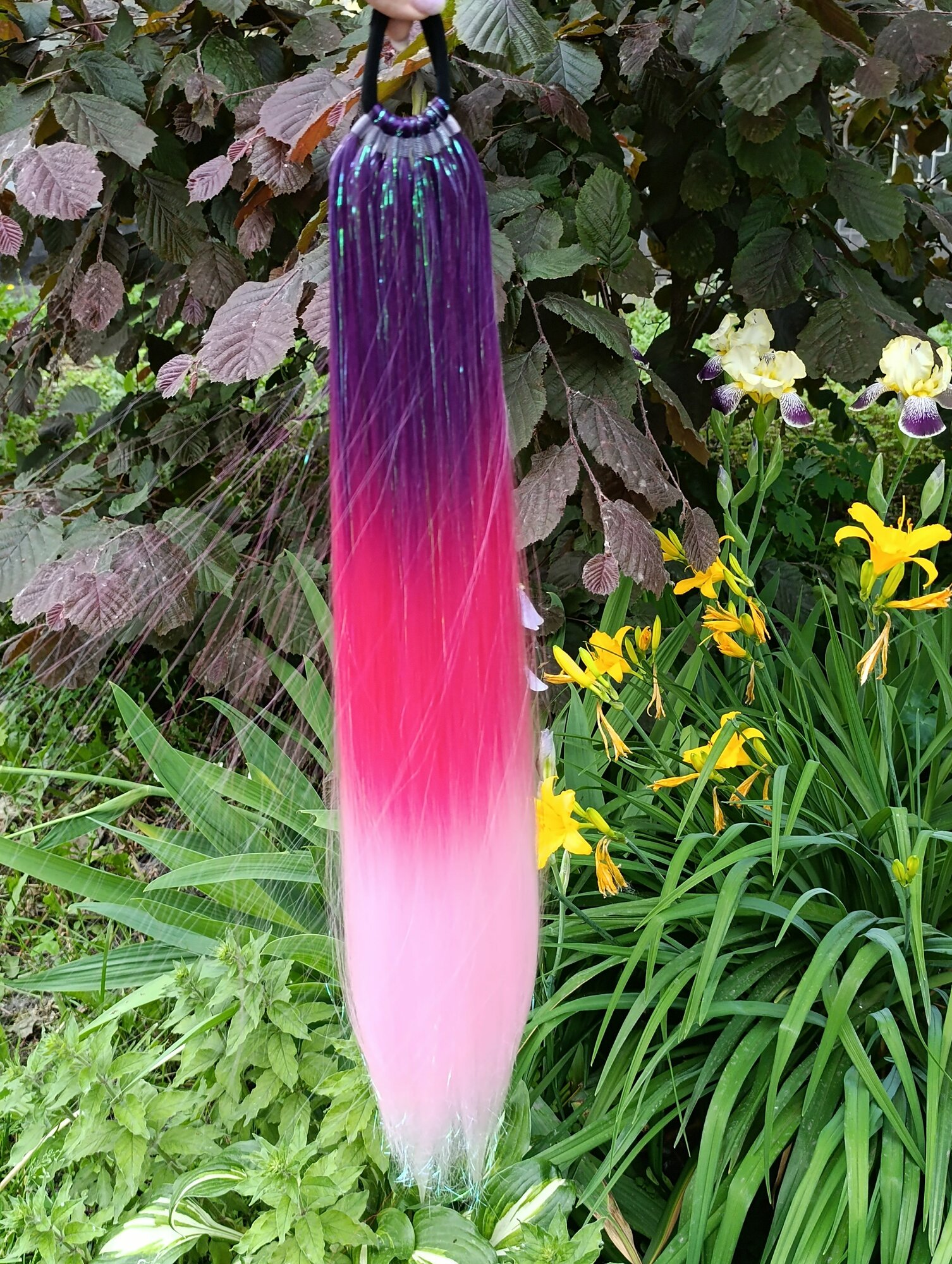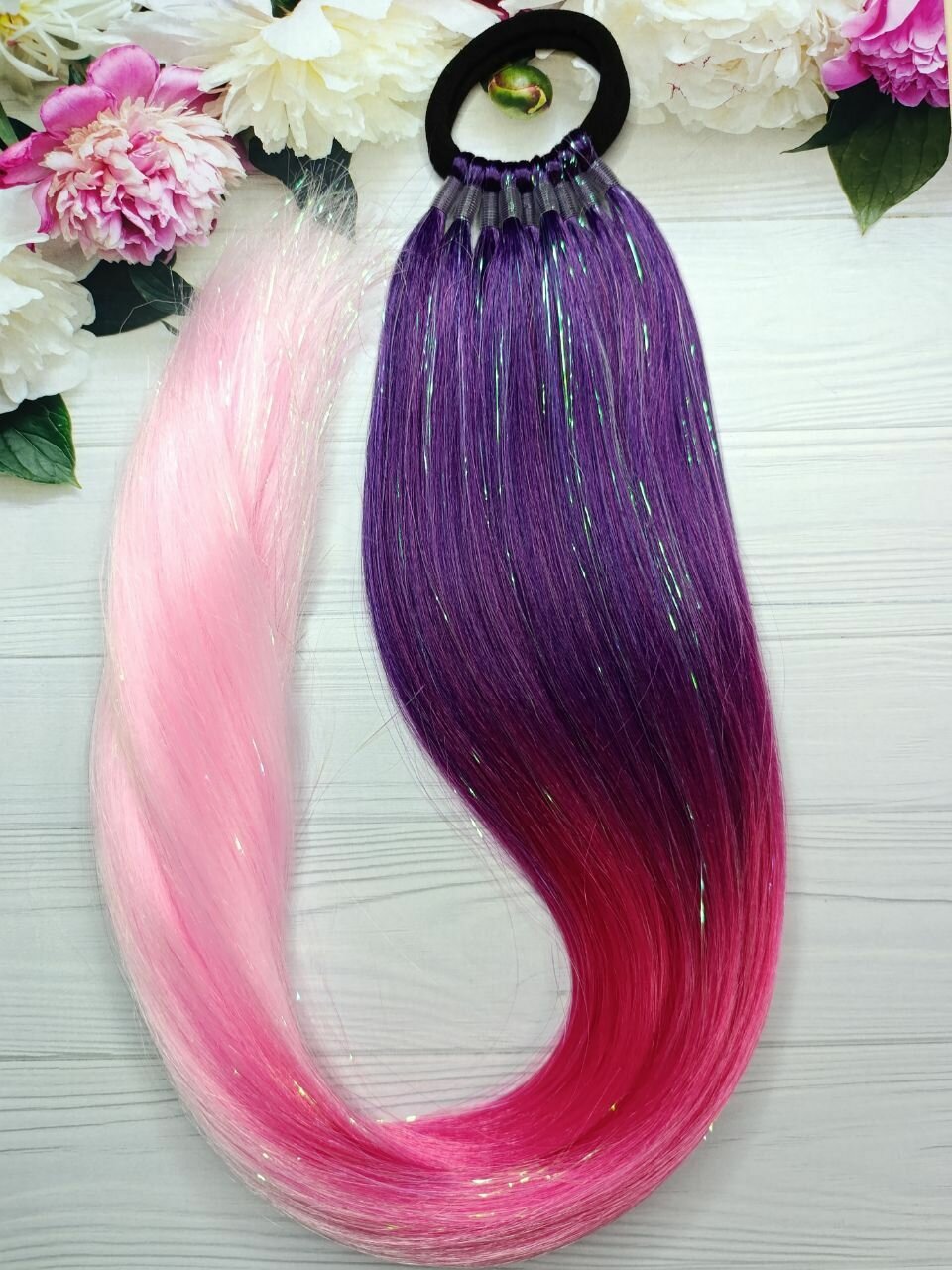 Купить Хвост на резинке с блестящими нитями, цветной, фиолетовый-малиновый-розовый 1шт