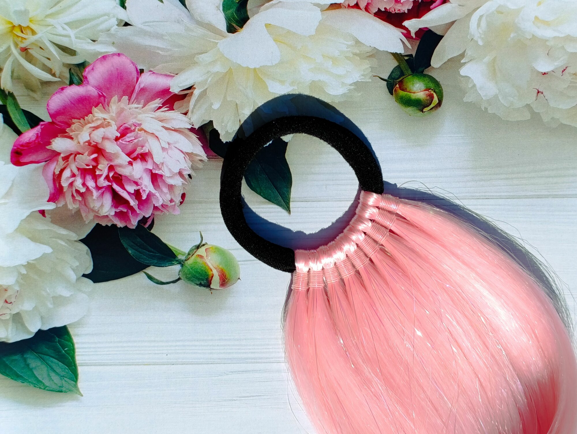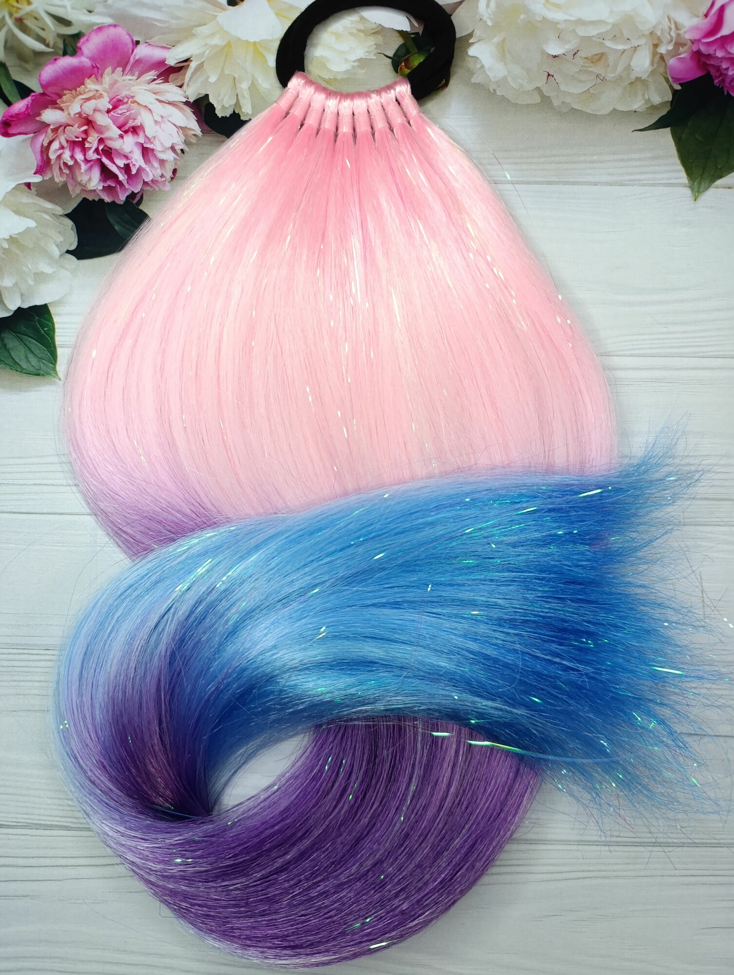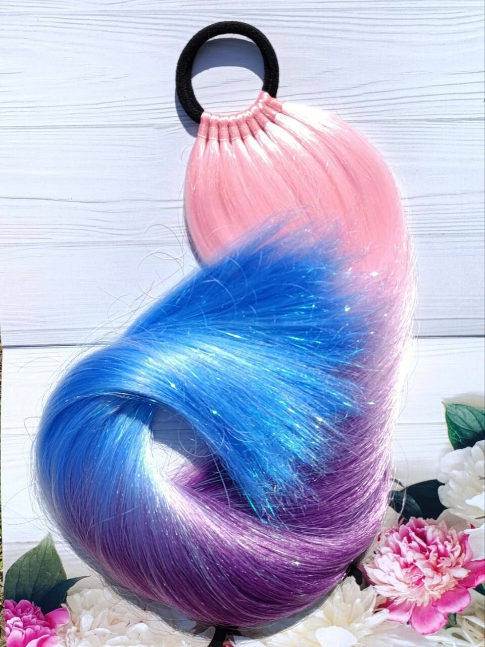 Купить Хвост на резинке с блестящими нитями, цветной, розовый-фиолетовый-голубой 1шт