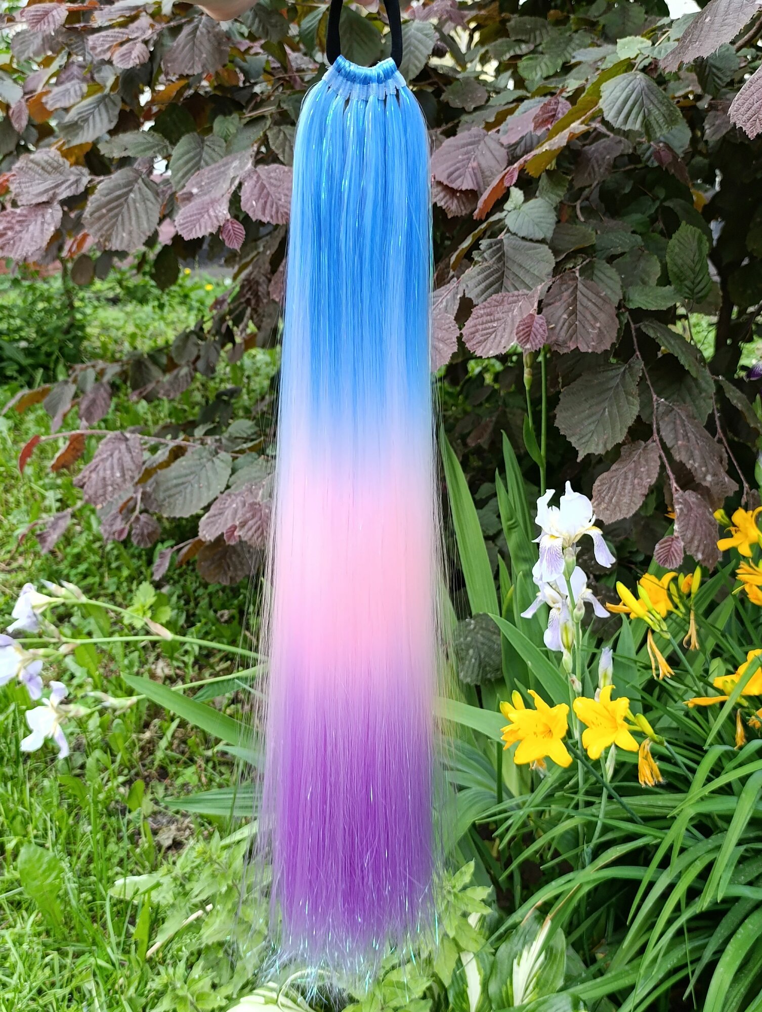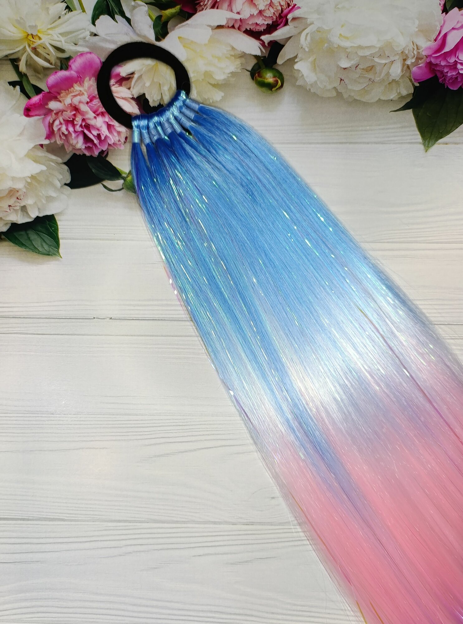 Купить Хвост на резинке с блестящими нитями, цветной, голубой-розовый-фиолетовый 1шт