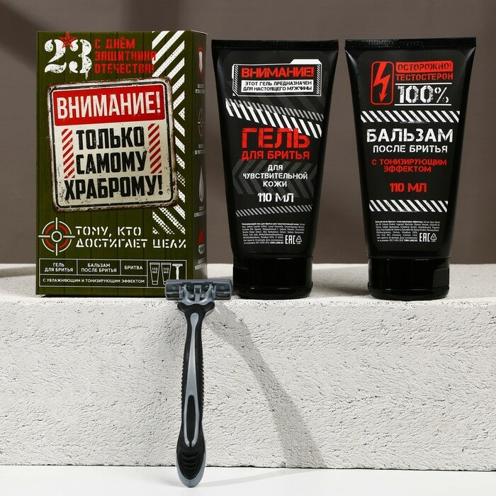 Подарочный набор косметики «Самому храброму», гель для бритья 110 мл, бальзам после бритья 110 мл, бритва, HARD LINE, 10026367 интересное: