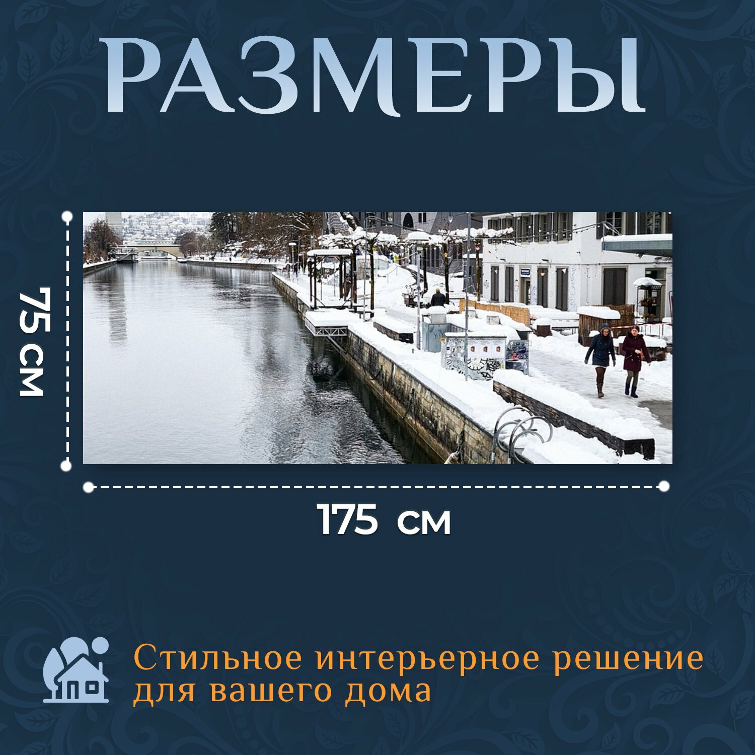 Картина на холсте "Снег, река, здания" на подрамнике 175х75 см. для интерьера интересное: