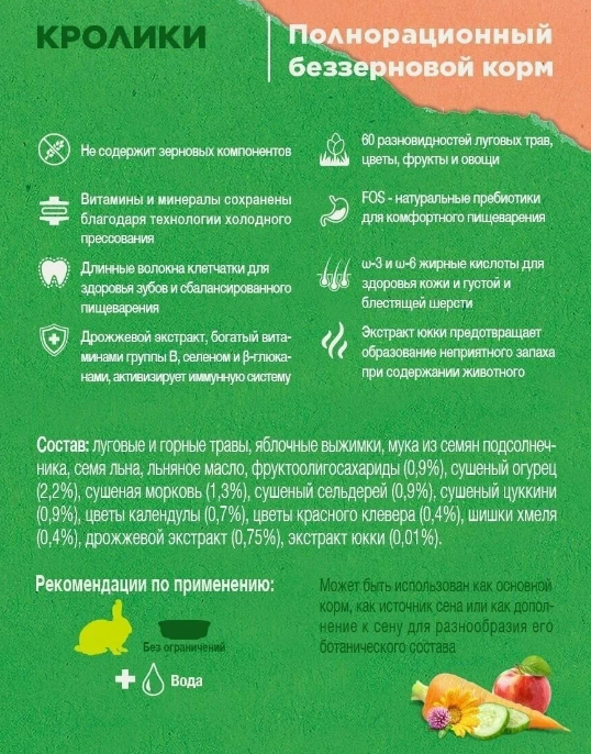 | Плюсы: | Хороший беззерновой корм для кроликов. |