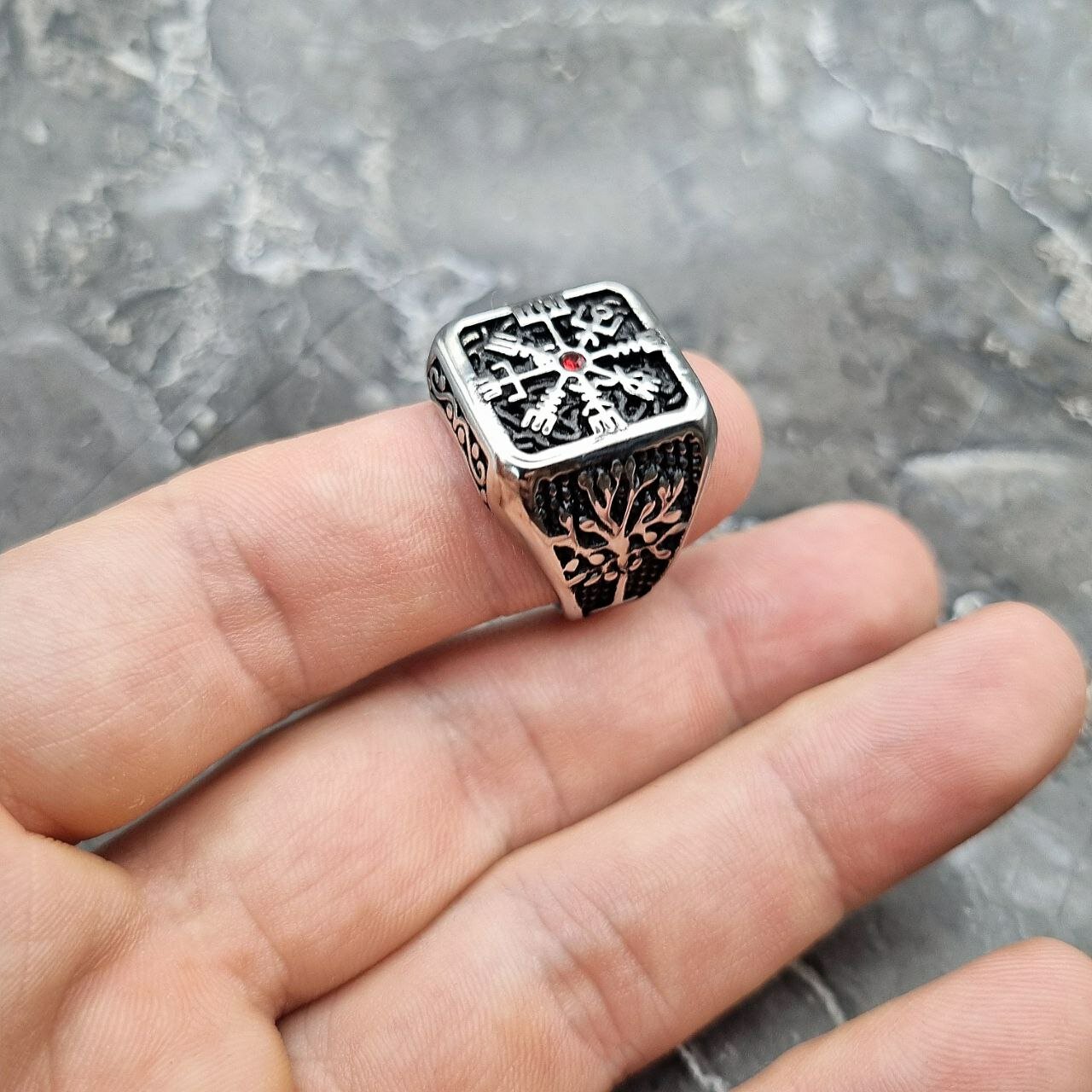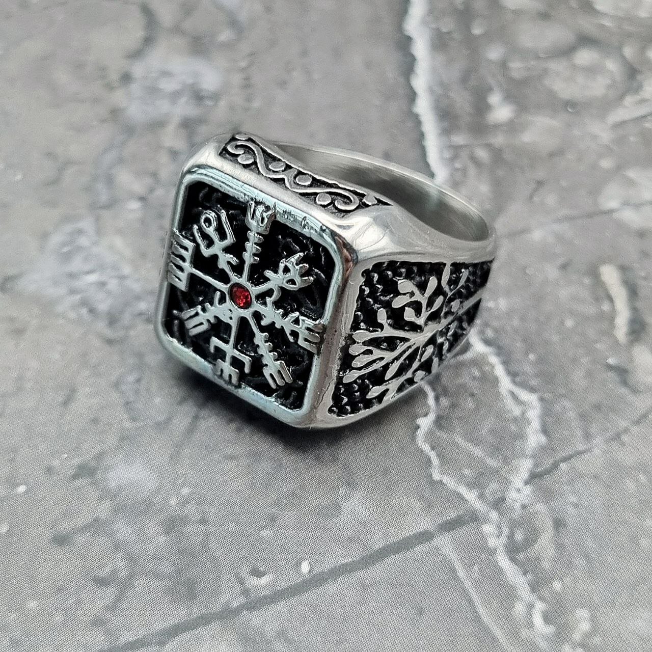 Кольцо печатка из нержавеющей стали Вегвизир с красным кристаллом, мужское, цвет серебристый, 22 размер