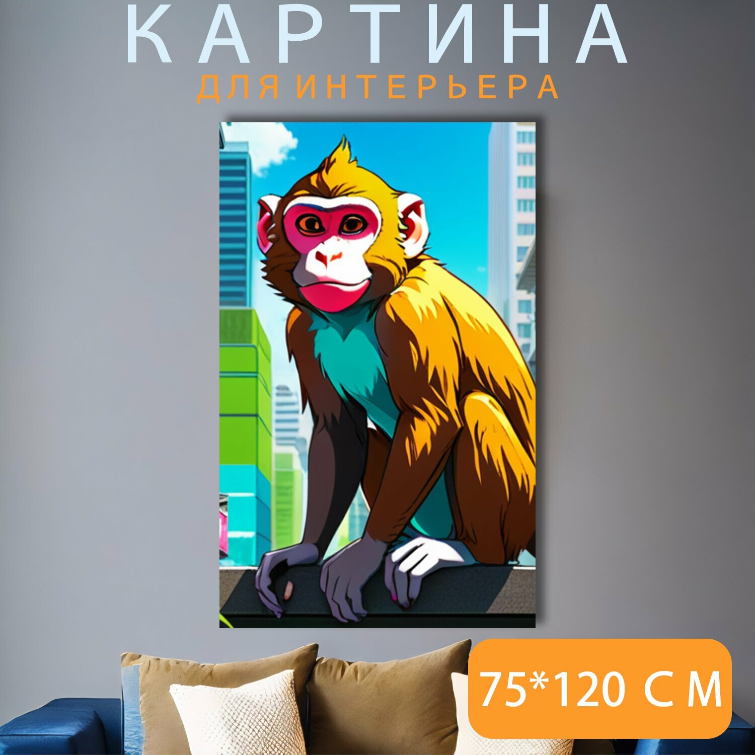 Картина на холсте В детскую комнату "Животные, звери, макакa в городе" на подрамнике 75х120 см. для интерьера интересное: