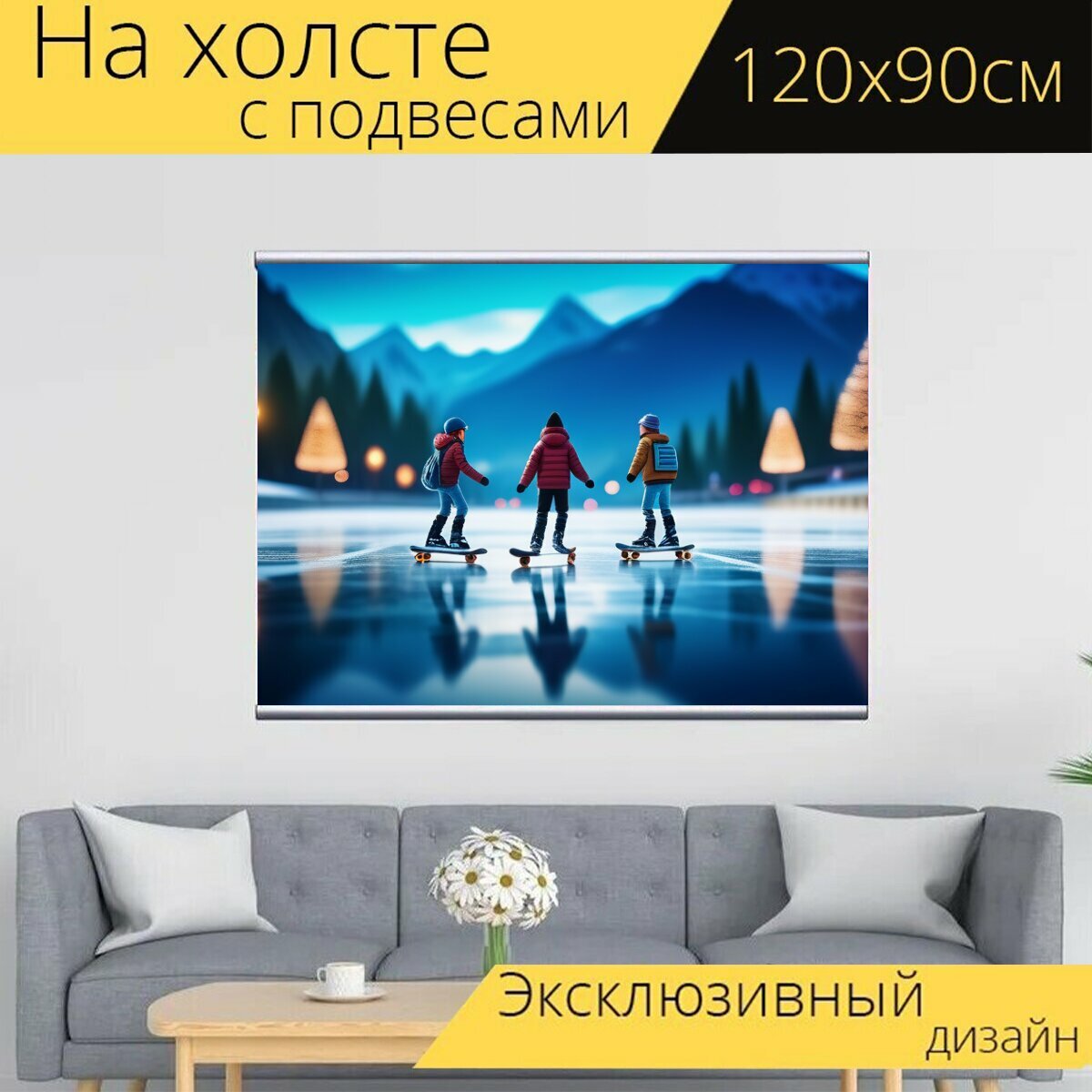 Купить Картина на холсте "Пейзаж с конькобежцами , " с подвесами 120х90 см. для интерьера на стену