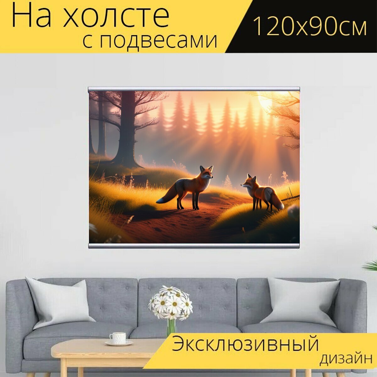 Картина на холсте "Пейзаж с лисами вдохновляющий, " с подвесами 120х90 см. для интерьера на стену интересное: