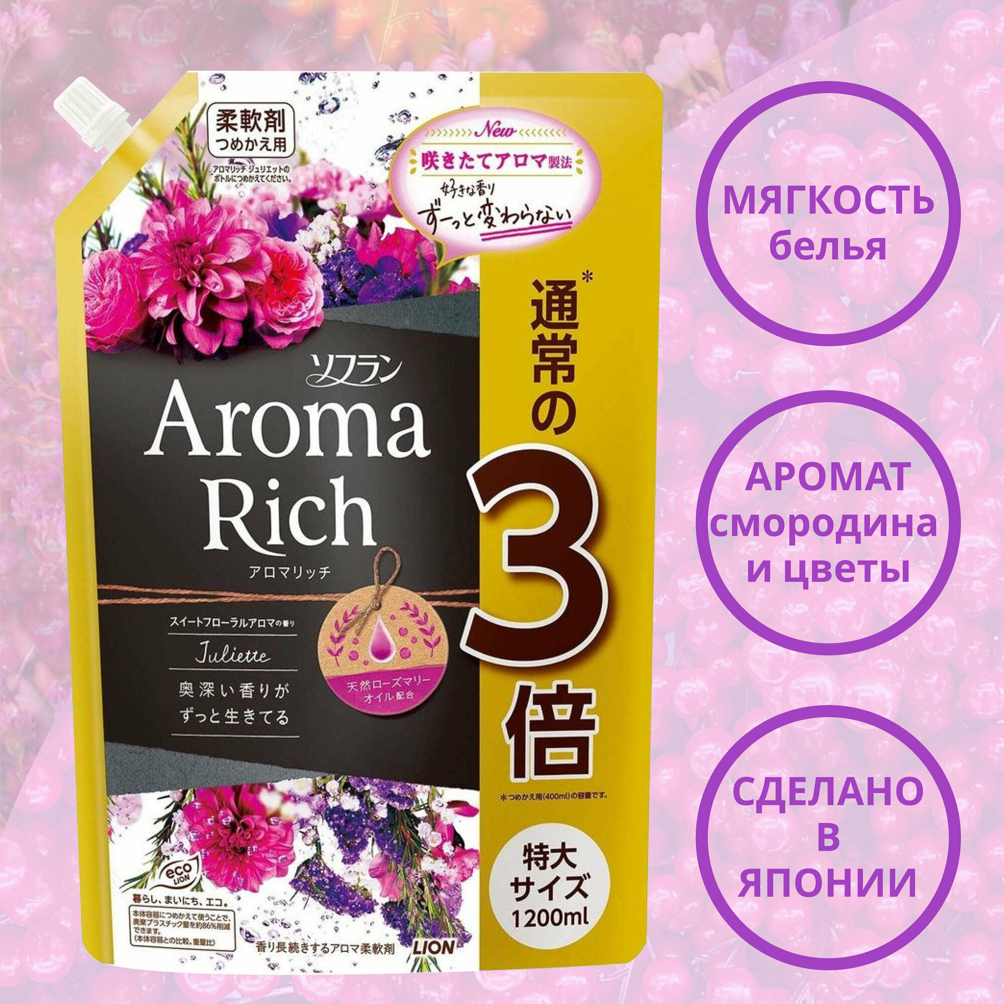Lion soflan aroma rich juliette ополаскиватель для белья дезодорирующий с натуральными ароматическими маслами, мягкая упаковка, 1200 мл