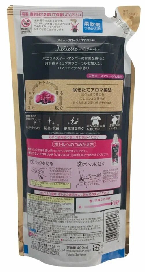 Lion soflan aroma rich juliette ополаскиватель для белья дезодорирующий с натуральными ароматическими маслами, мягкая упаковка, 400 мл