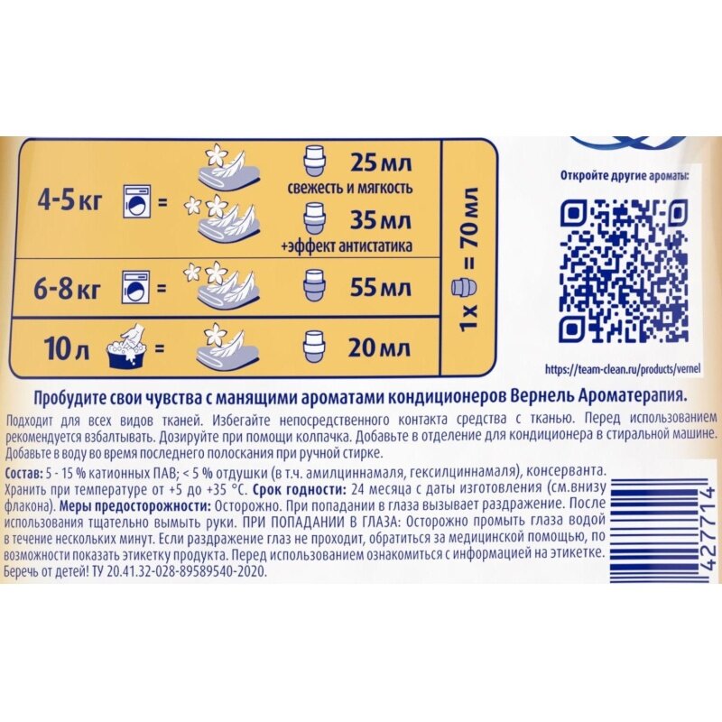 Кондиционер для белья вернель Ароматерапия+ Пион и белый чай, 1.74л