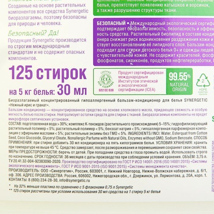 Купить Бальзам-кондиционер для стирки Synergetic Нежный ирис и гранат, 3,75 л