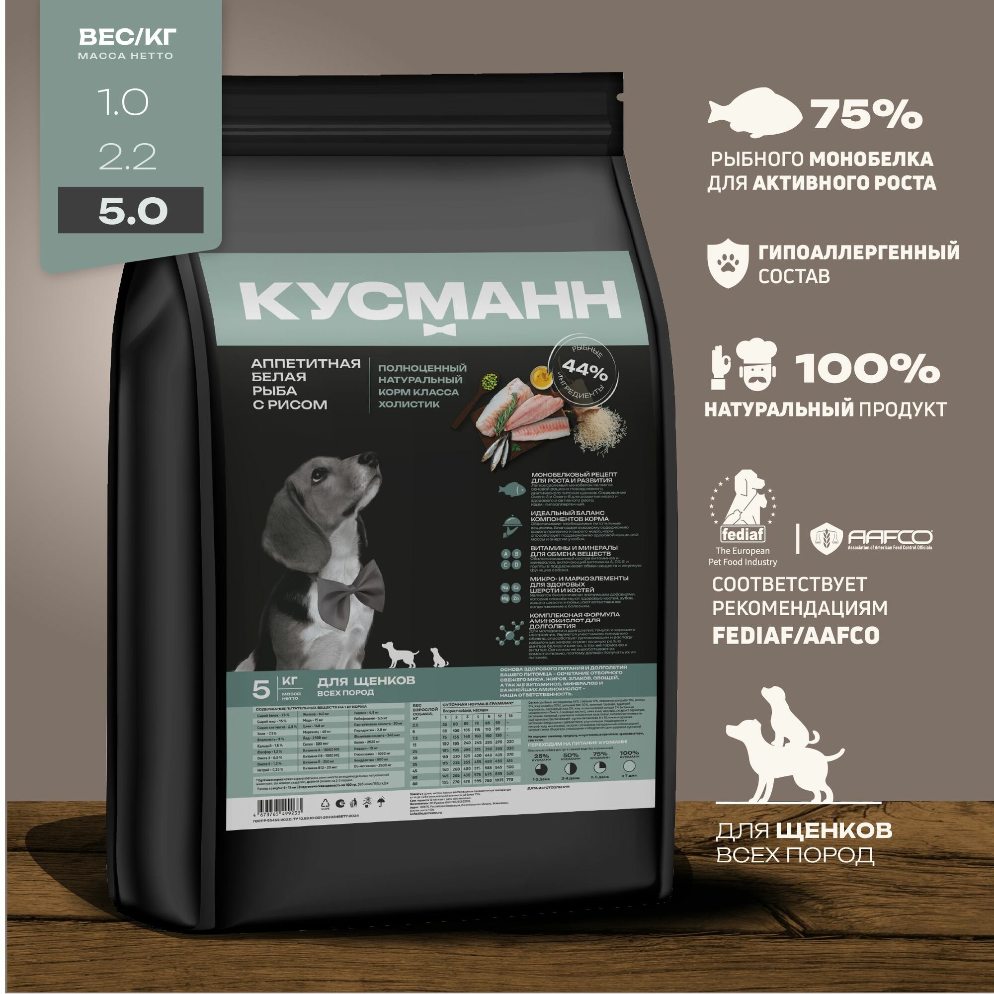 Купить Корм сухой кусманн Холистик Аппетитная Белая Рыба с Рисом - для щенков всех пород монобелок, гипоаллергенный супер премиум 5 кг