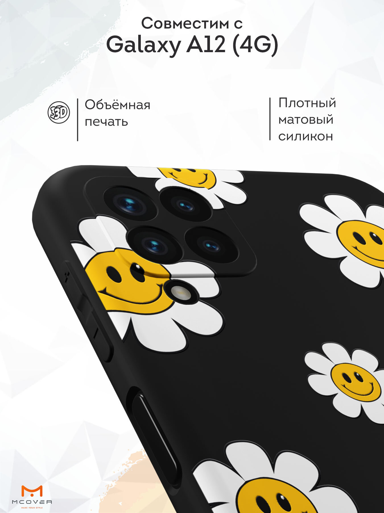 СохранитьСиликоновый чехол Mcover на Samsung Galaxy A12 (для Самсунг Галакси А12), Ромашки смайлик интересное: