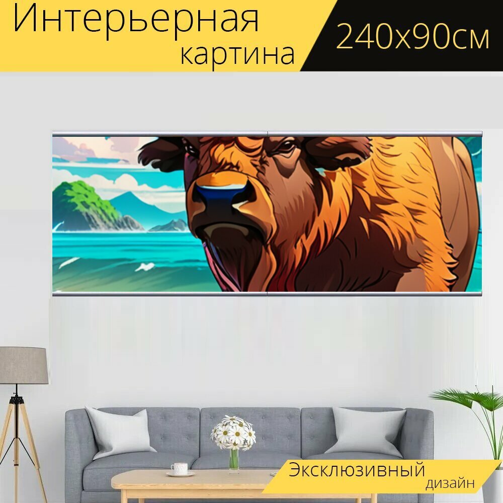 Купить Картина на холсте В детскую комнату "Животные, звери, зубр на море" с подвесами 240х90 см. для интерьера на стену