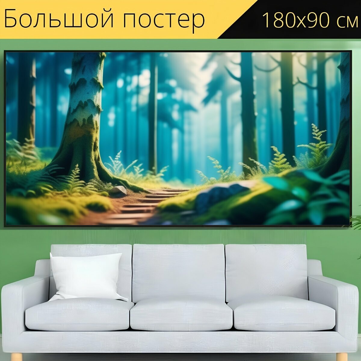 Большой постер "Пейзаж с лесом акварель , " 180 x 90 см. для интерьера на стену интересное: