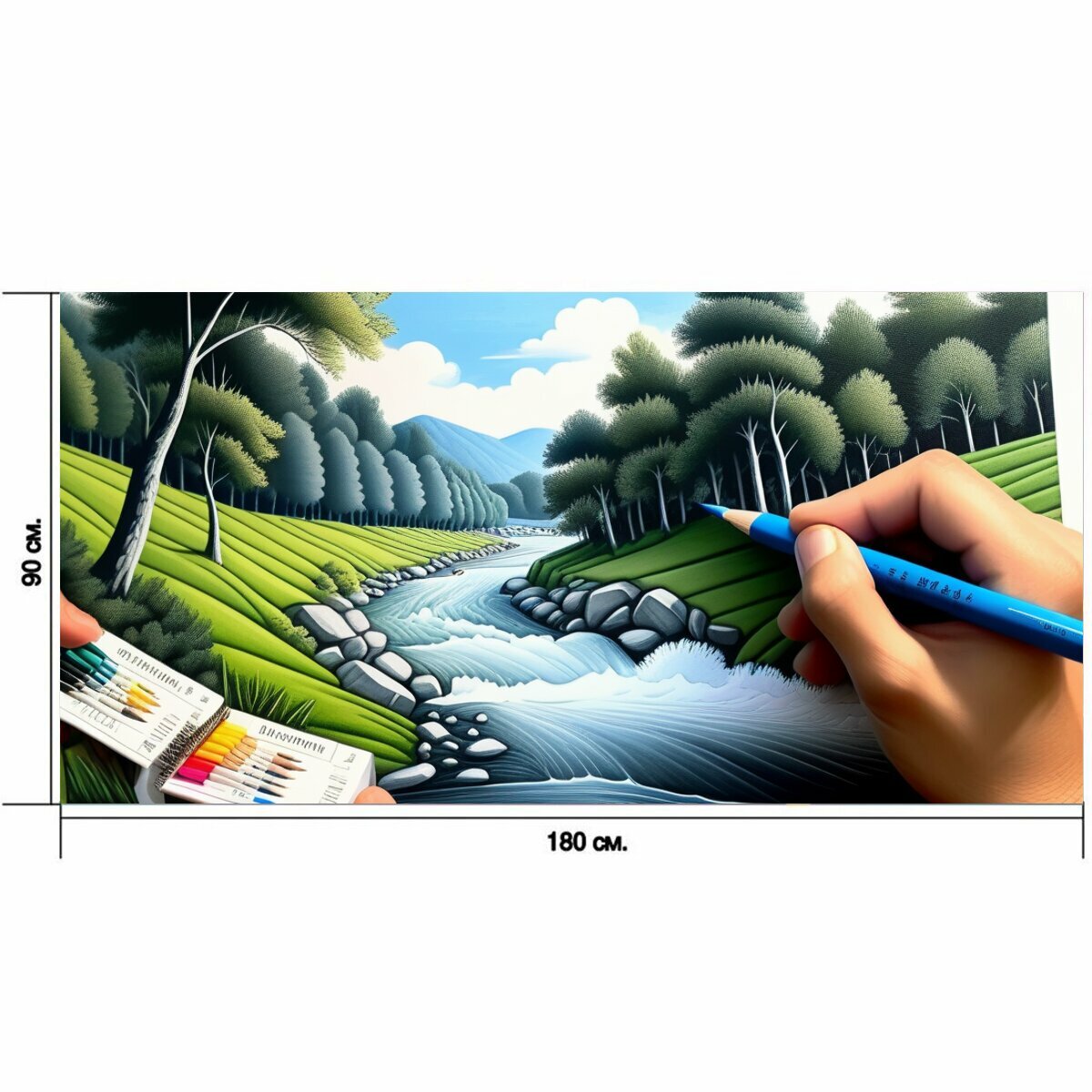 Большой постер "Нарисовать пейзаж с речкой максимал, " 180 x 90 см. для интерьера на стену интересное: