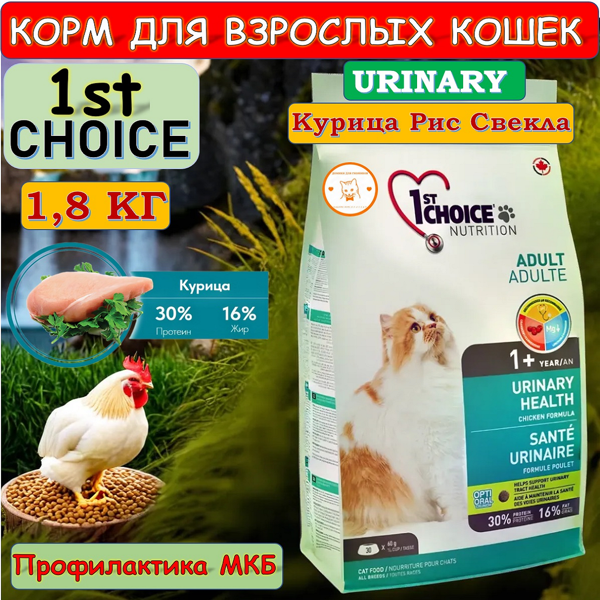 Корм сухой 1st Choice Urinary, для взрослых кошек для здоровья мочевыделительной системы, с курицей, 1,8 кг