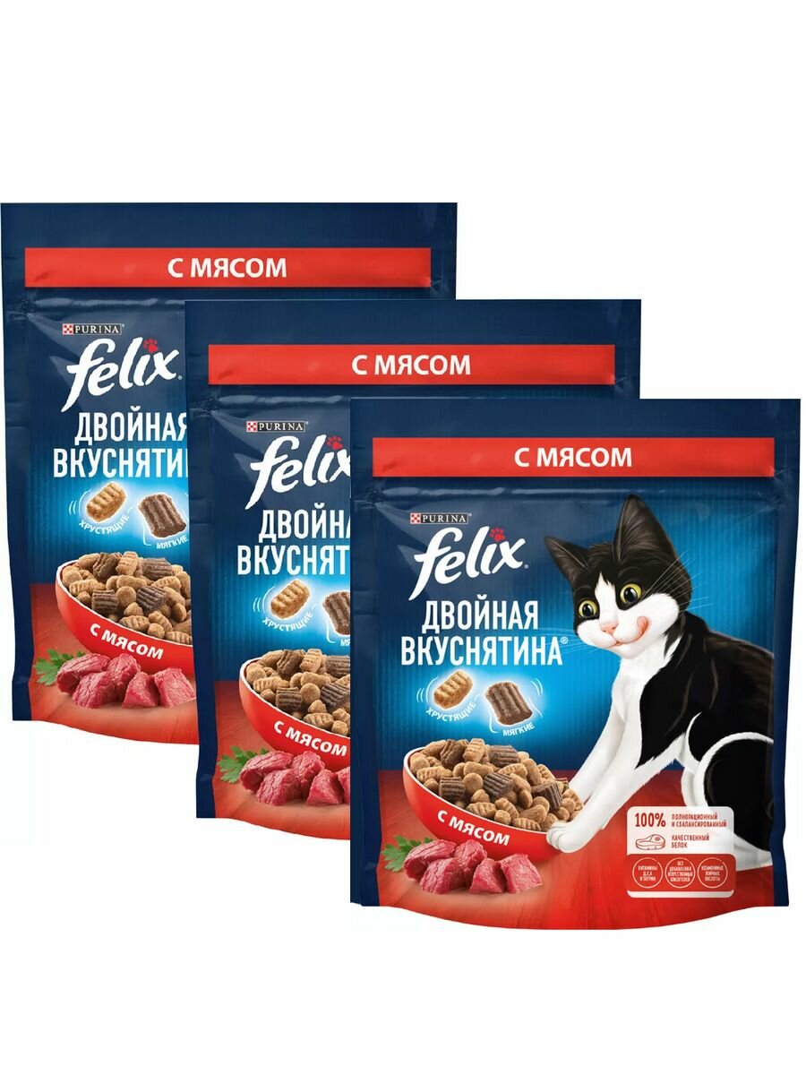 Купить Сухой корм Felix для взрослых кошек, Мясо, Двойная вкуснятина, 200 г, 3 шт