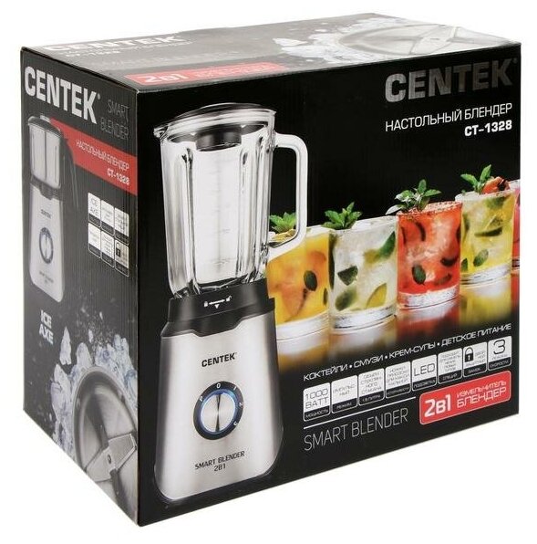 Блендер стационарный Centek CT-1328, 1000 Вт, 3 реж+имп, стекл стакан 1.5л, стальн стакан 0.5л