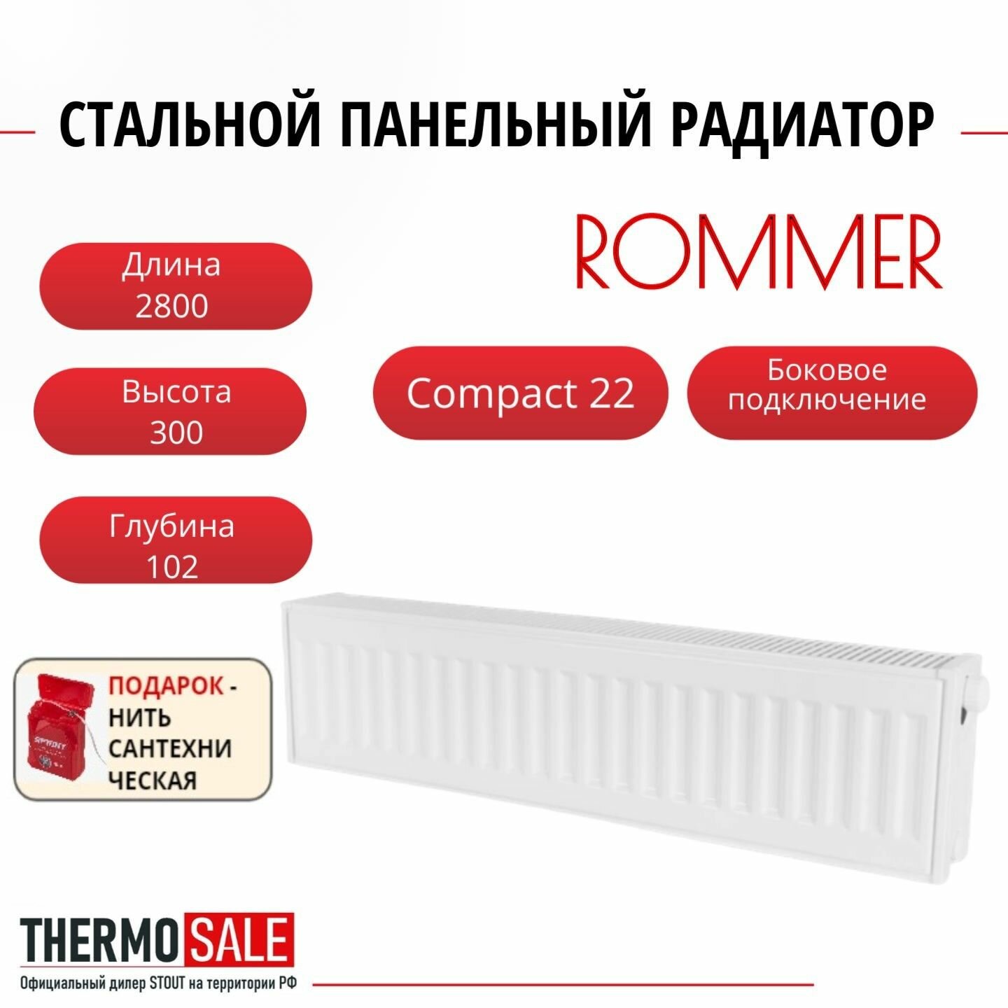 Радиатор стальной панельный ROMMER 300х2200 боковое подключение Compact 22/300/2200 Нить сантехническая
