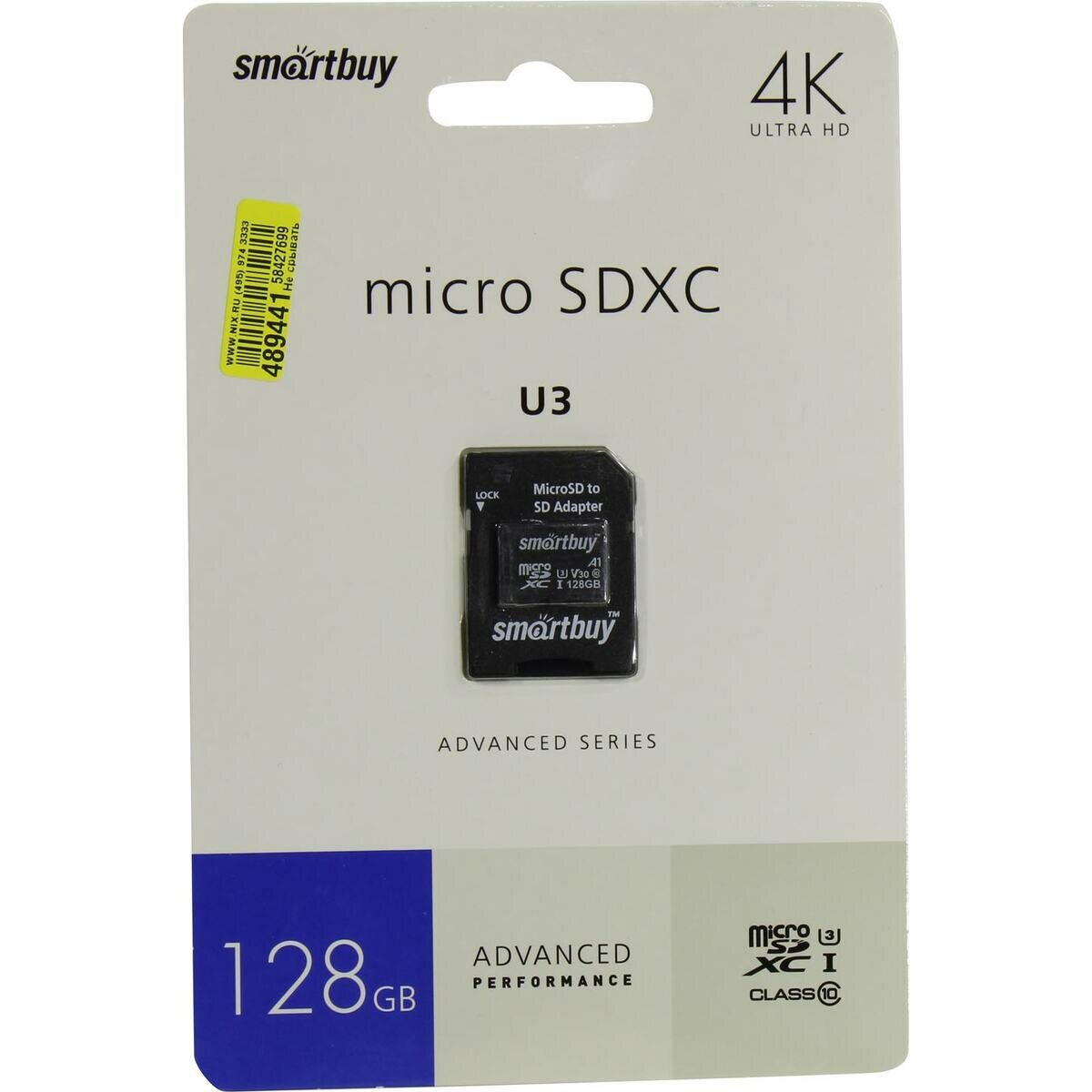 micro SDXC карта памяти Smartbuy 128GB U3 V30 A1 Advanced R/W up to 90/55 с адапт (SB128GBSDU1A-AD)