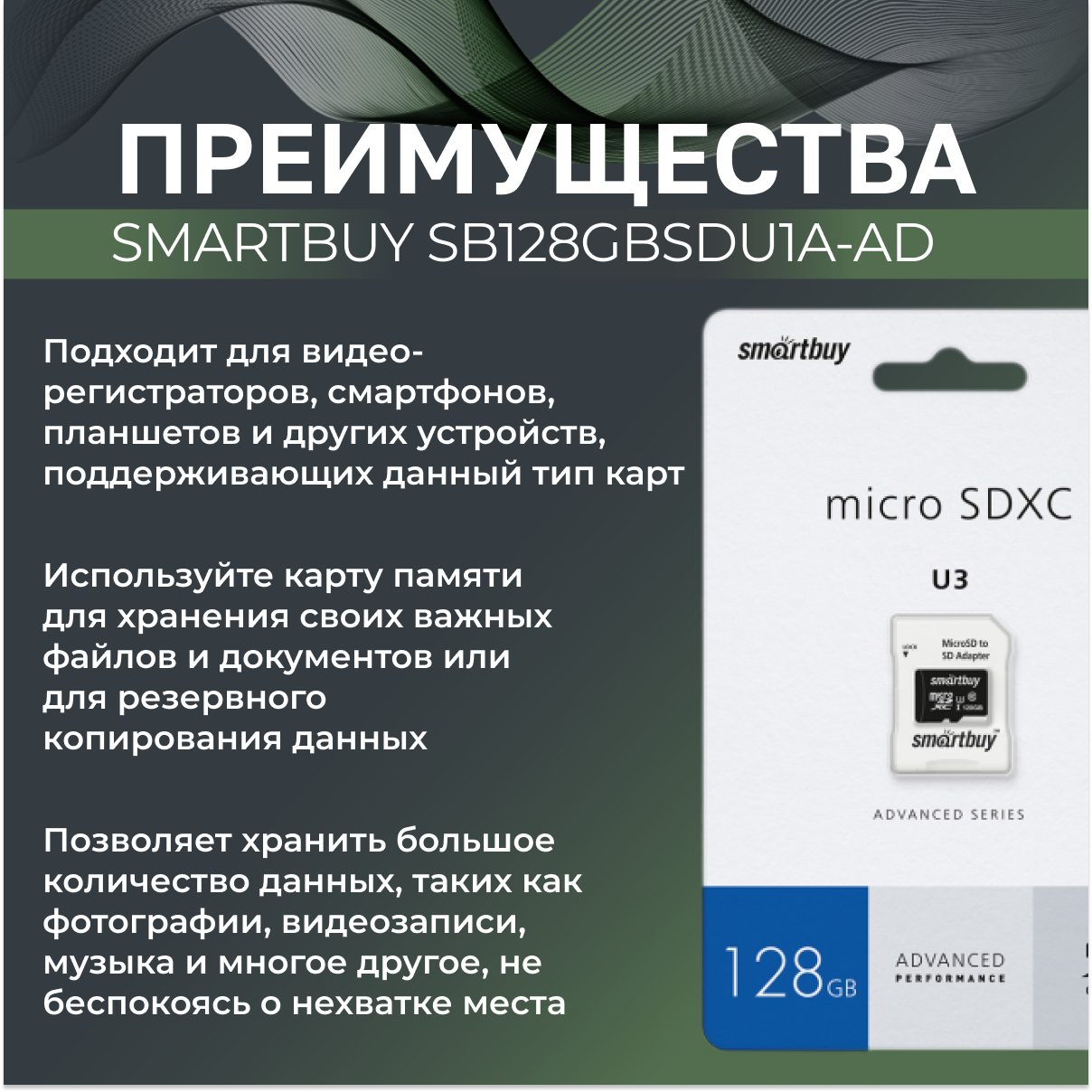 smartbuy (sb128gbsdcl10-01) microsdxc 128gb class10 uhs-i u1 + адаптер карта памяти