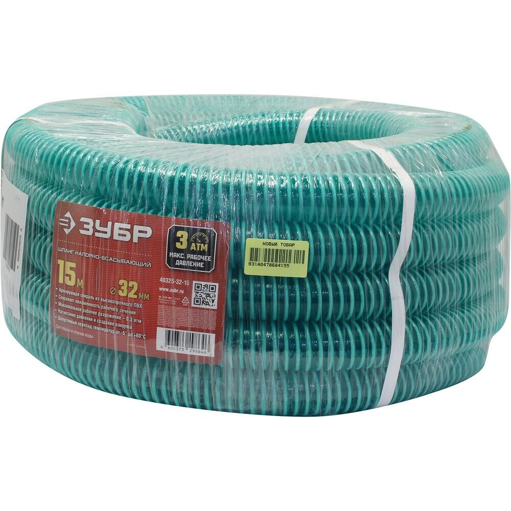 ЗУБР 32 мм x 15 м, 3 атм, со спиралью ПВХ, напорно-всасывающий шланг (40325-32-15)