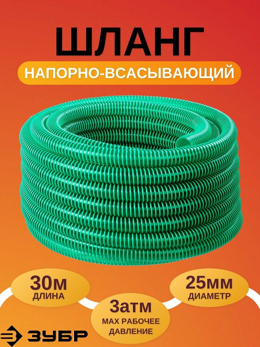 ЗУБР размеры 25 мм x 30 м, 3 атм, со спиралью ПВХ, напорно-всасывающий шланг (40325-25-30)