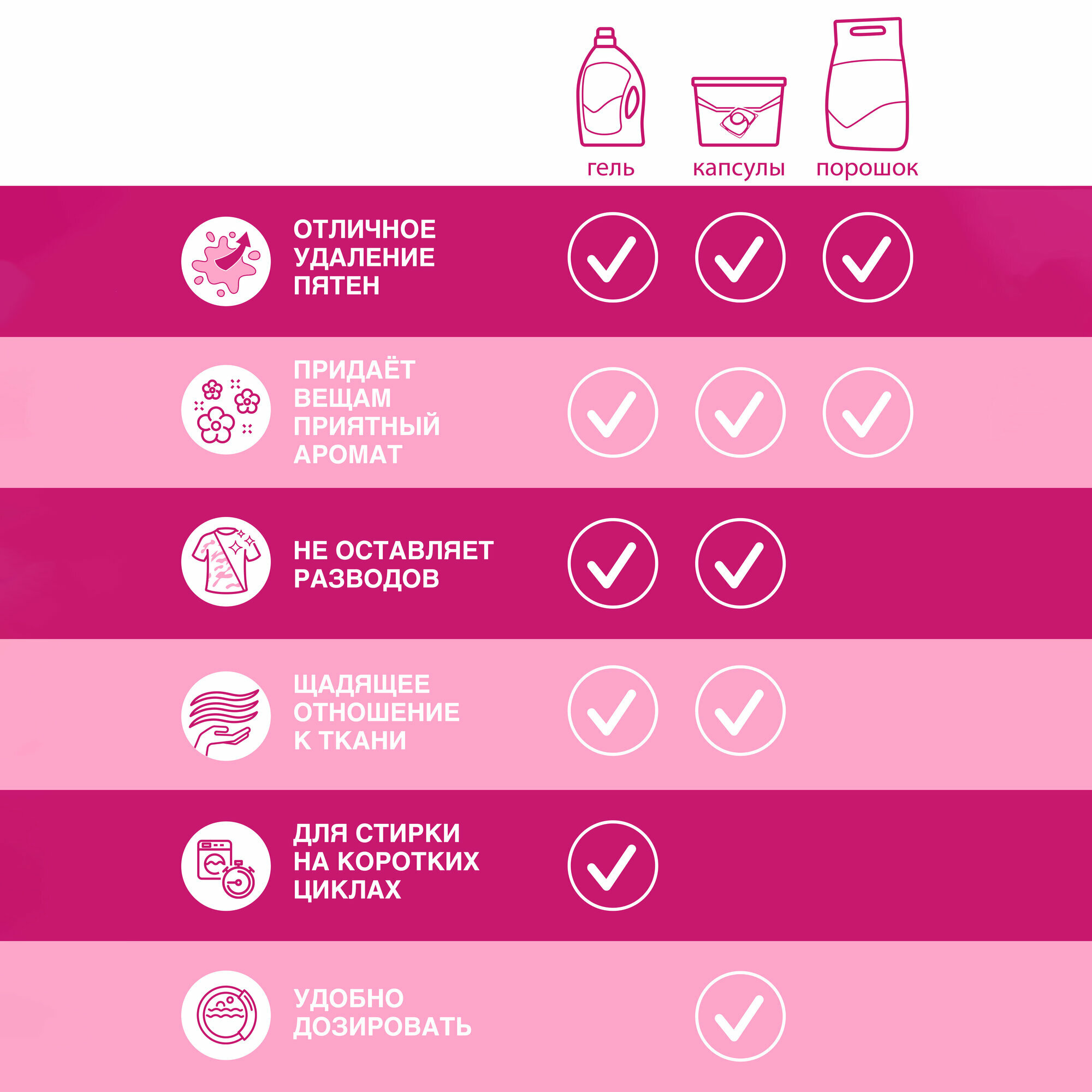| Плюсы: | Отличный аромат, цветочный. Отстирывает и отстирывается хорошо. |