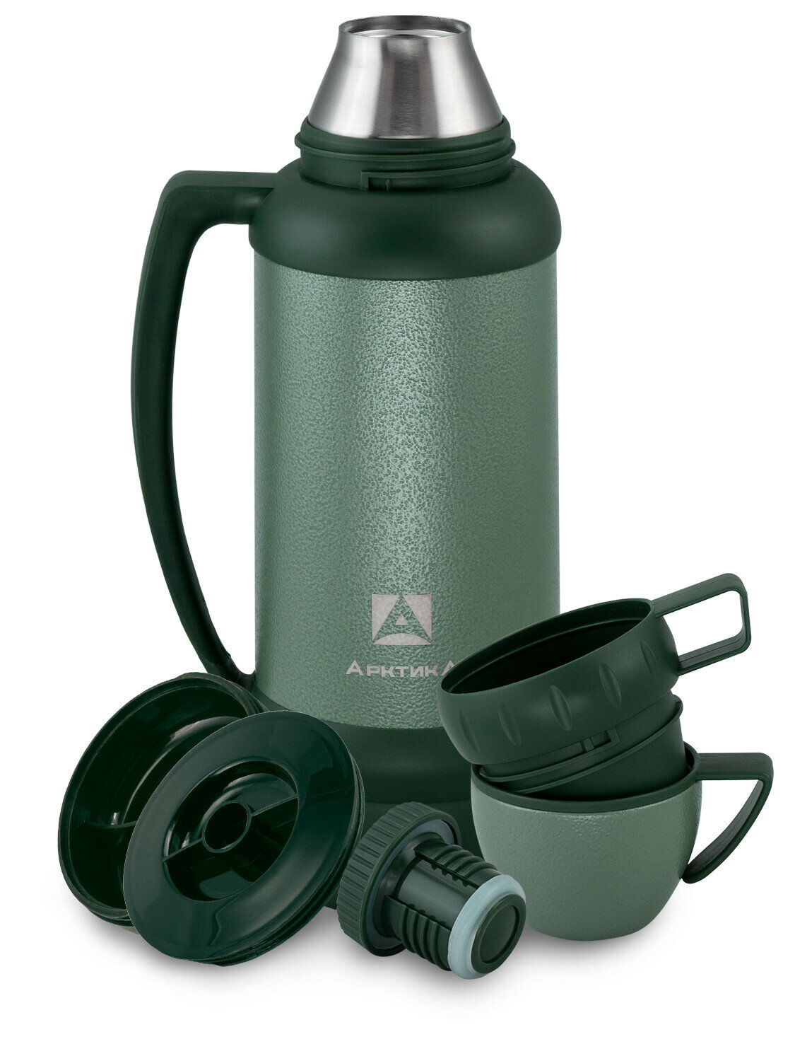 Термос Арктика 109-1800М, узк. горло, 1,8л (зеленый) молот. сталь, ручка, 2 чашки+емк, нерж. сталь