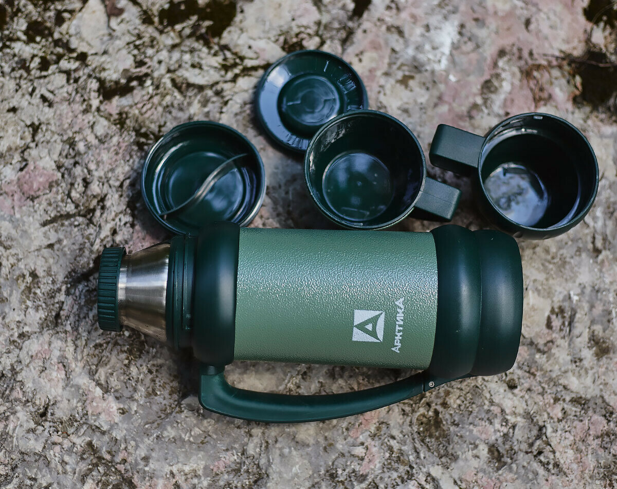 | Плюсы: | Держит температуру достаточно долго в полевых условиях. Выглядит брутально. Легко моется. Удобные кружки. |