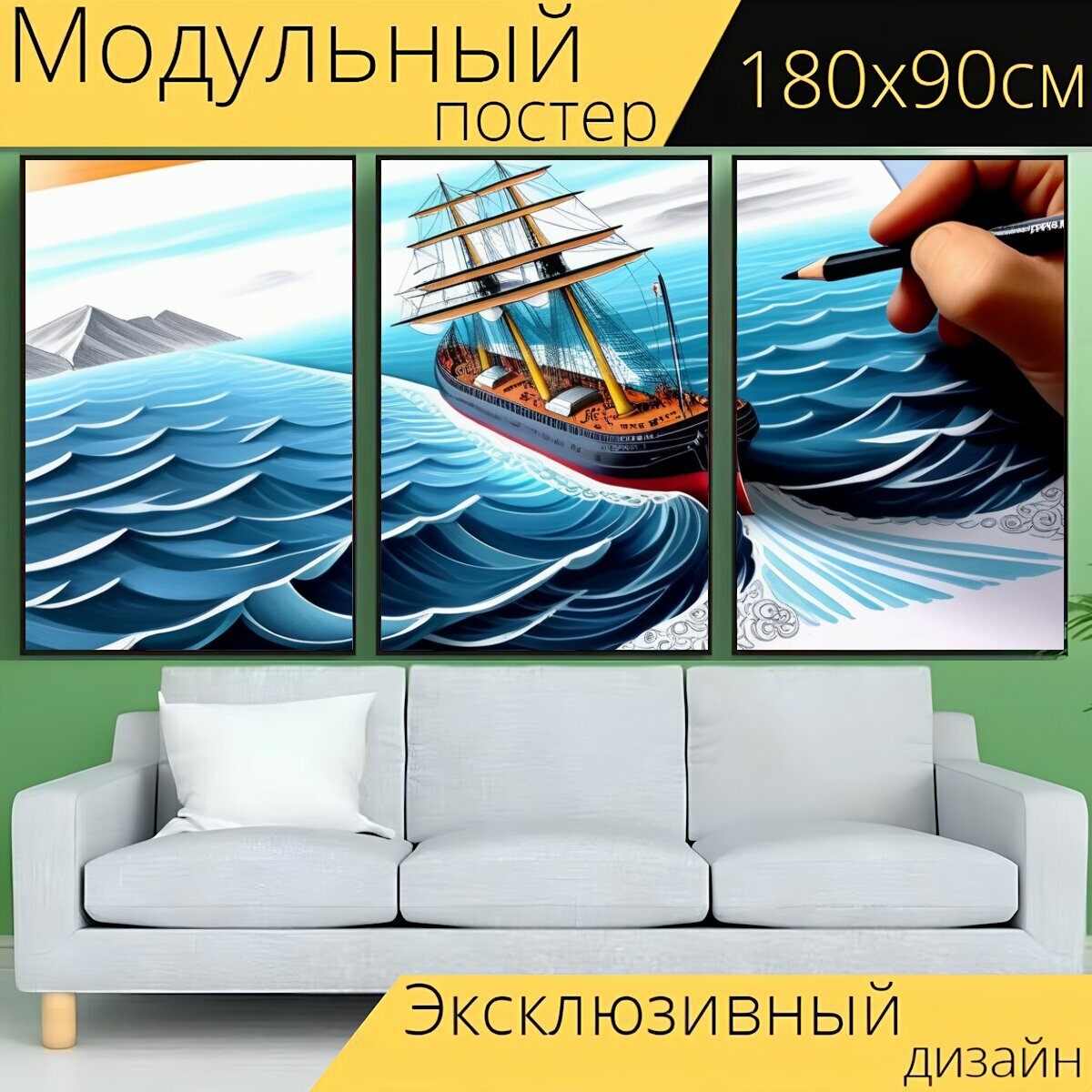 Модульный постер "Рисовать пейзаж с кораблем вдохновляющий, " 180 x 90 см. для интерьера на стену интересное:
