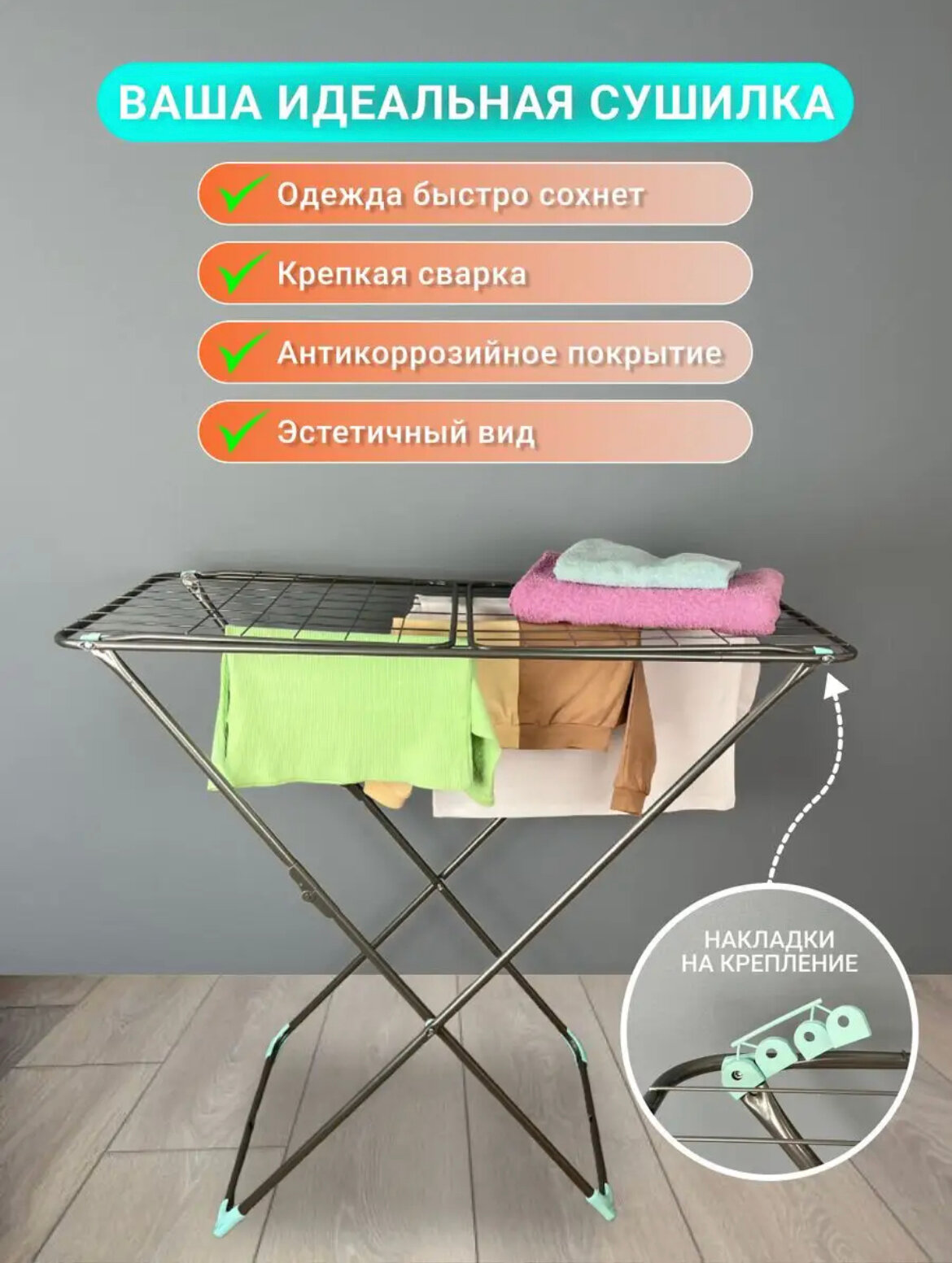Складывается в компактную сушилку и отлично становится за шкаф и ее не видно совершенно. Если ищите недорогую сушилку, то однозначно выбирайте этот вариант. |